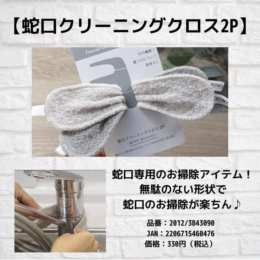 気がつくと蛇口に水垢やカルキ汚れがついていたこと、ありませんか。そんなとき便利なのが、「蛇口クリーニングクロス」です。蛇口専用の掃除アイテムで、クロスを左右にこするだけで水垢をスルンと落とすことができるアイテム。素材のレーヨンは蛇口を傷つけにくいため安心。2個入りで330円商品というコスパも◎。お風呂場の蛇口にも効果てきめんのようです。