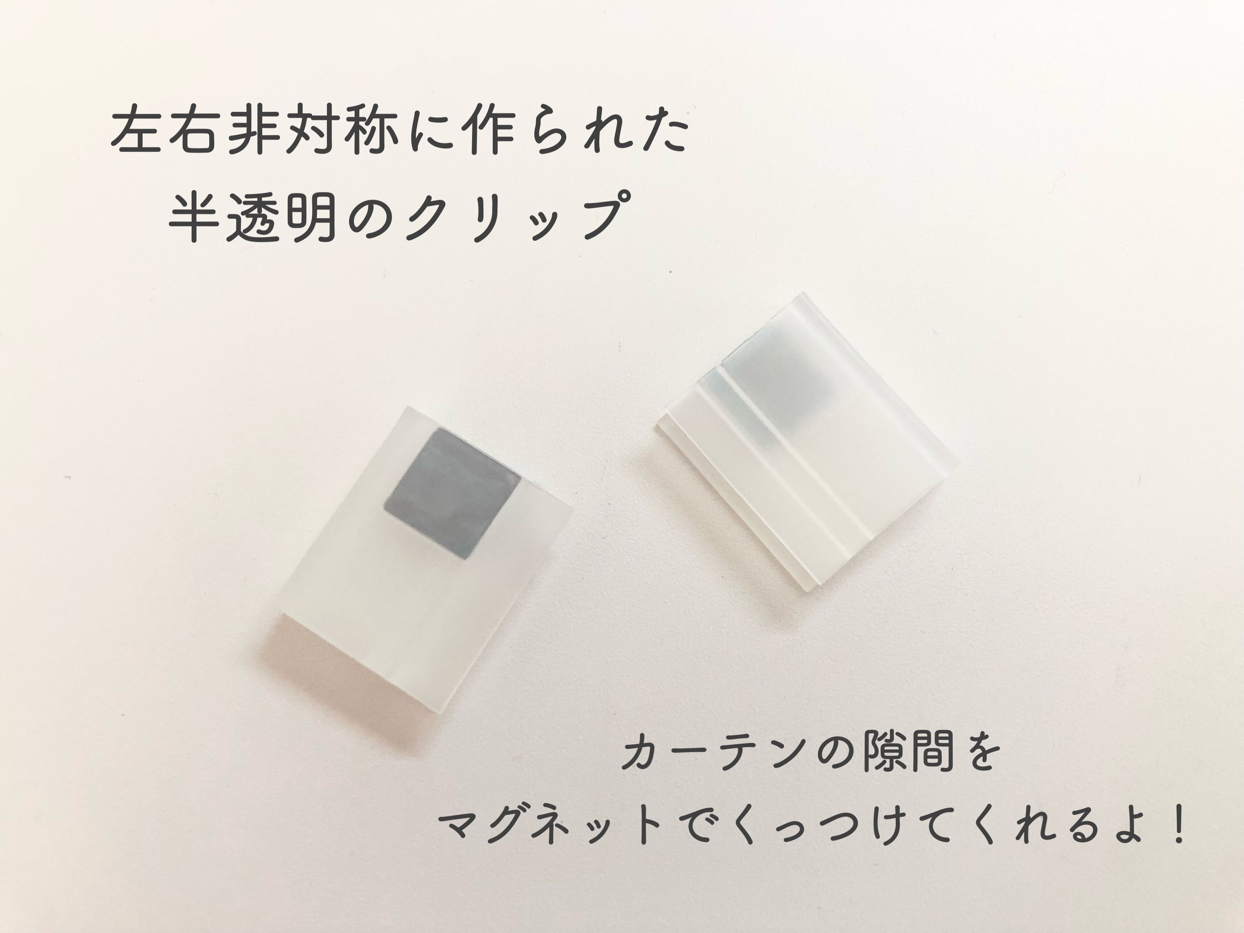 こちらの「カーテンの隙間防止クリップ」は、左右非対称につくられたマグネットつきのクリップです。