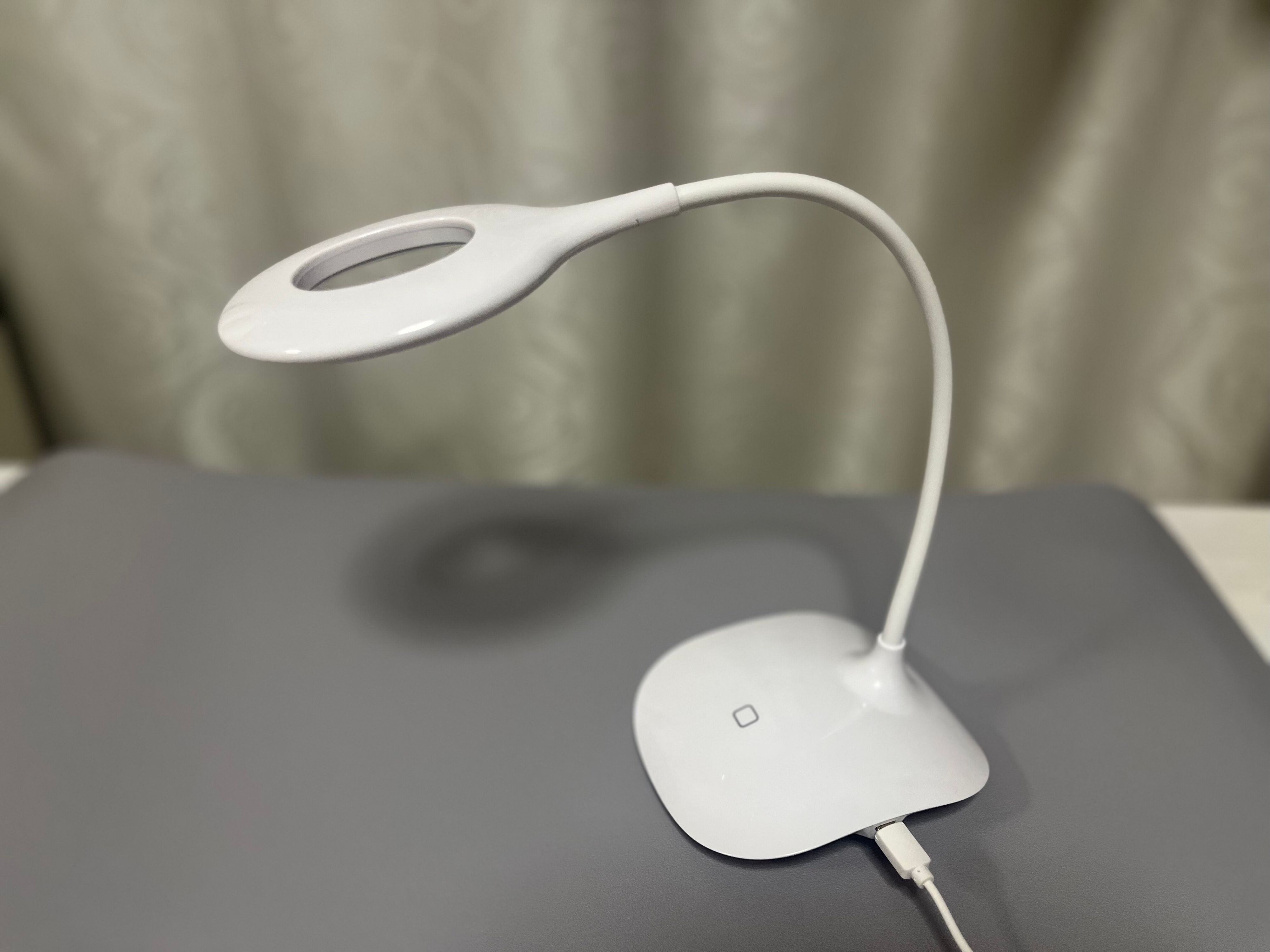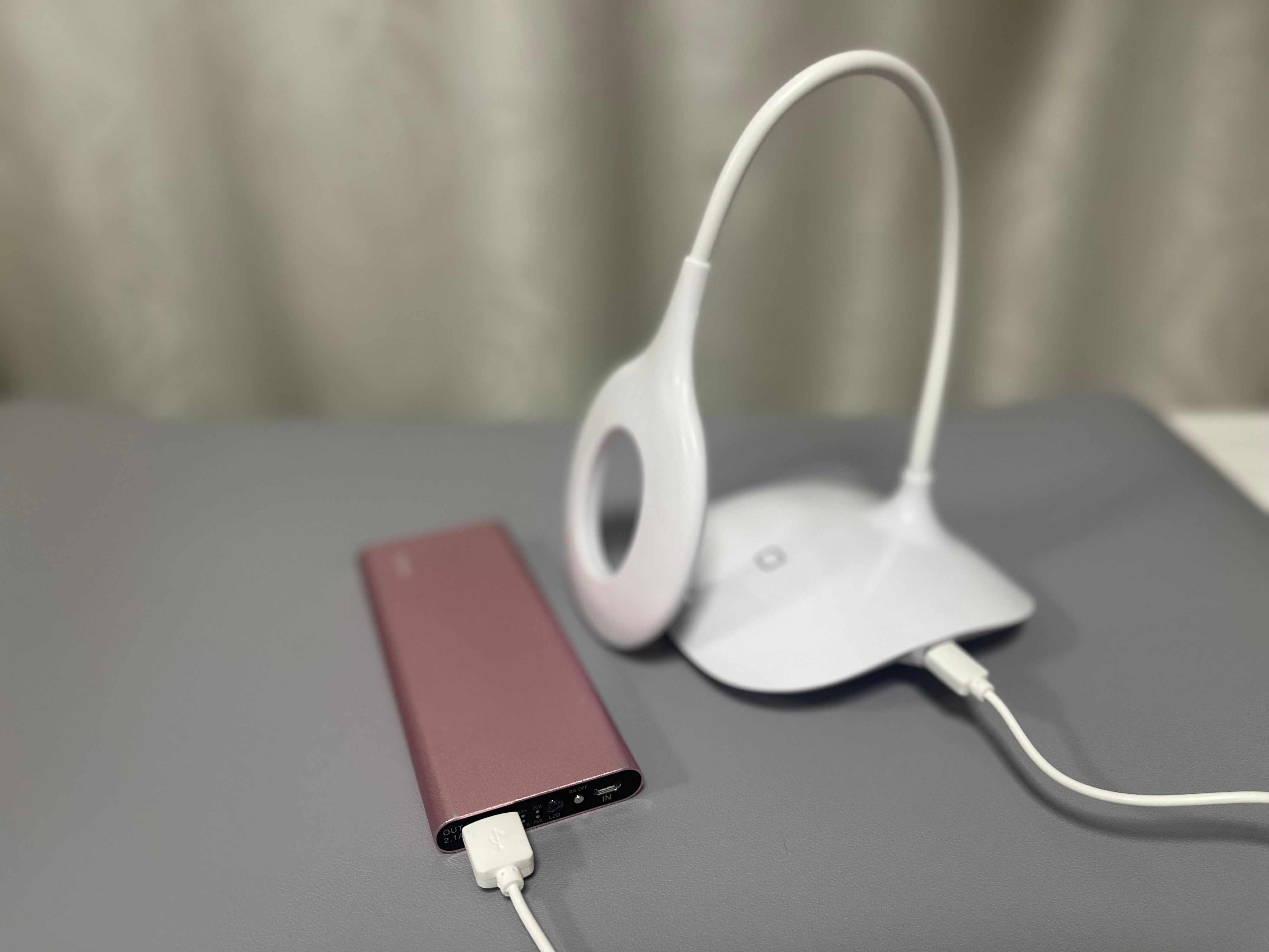 本体はとても軽く、アームは好きな角度にぐにゃりと曲がります。写真のように2つ折りにしても大丈夫!パソコンのUSB接続はもちろん、モバイルバッテリーも使用できますので持ち運び用にもオススメです。