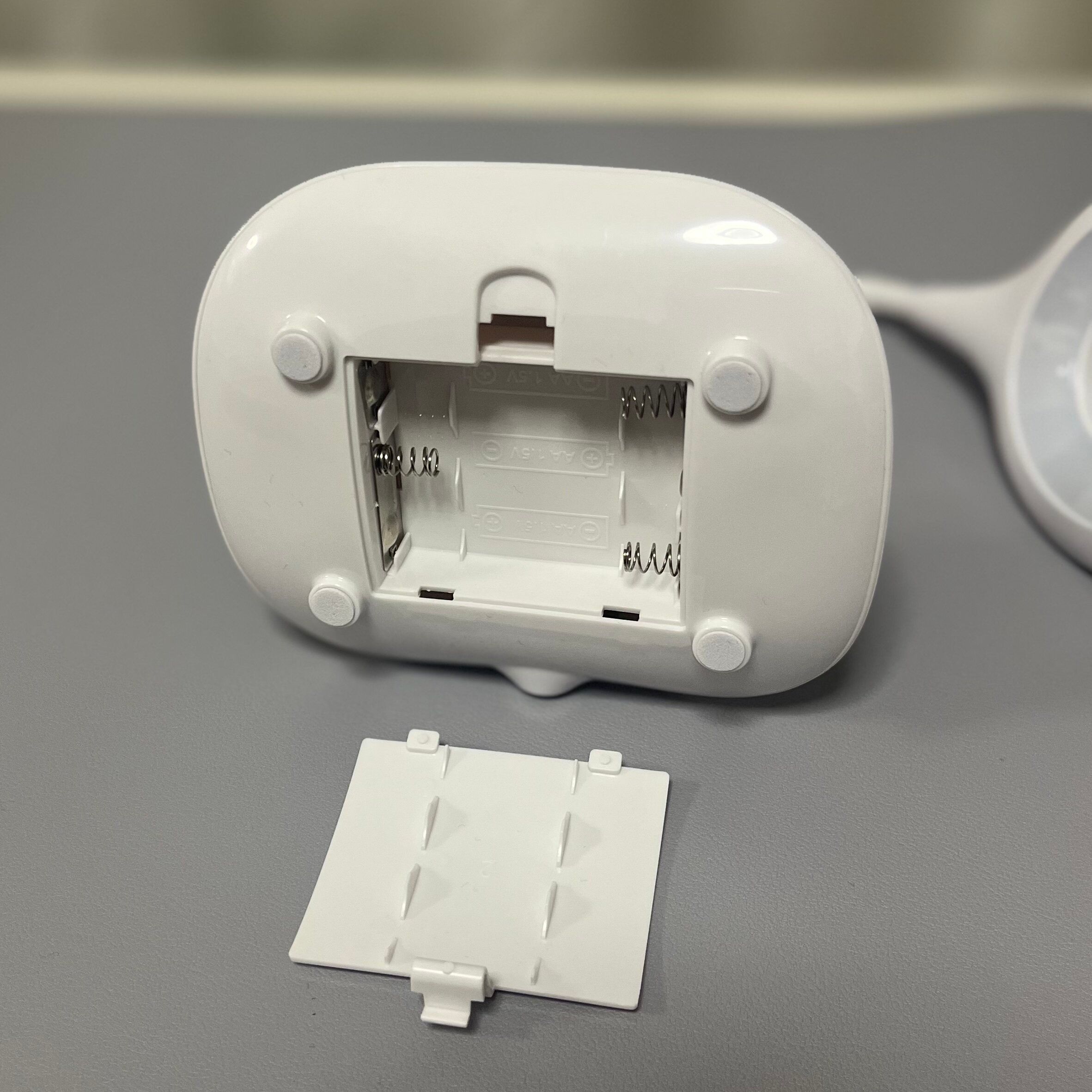 本体底部に乾電池を入れます。本体はとても軽くて倒れやすいので、電池を入れて使用すると重り代わりになって安定します。