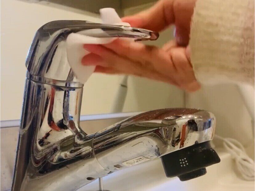 メラミンスポンジを濡らして、蛇口をタオルで拭くような感覚で隅々に滑らせていきます。サイコロ状のメラニンスポンジと違って蛇口のカーブしているところも簡単に磨くことができます。シートの特長を活かすことができますよ。
