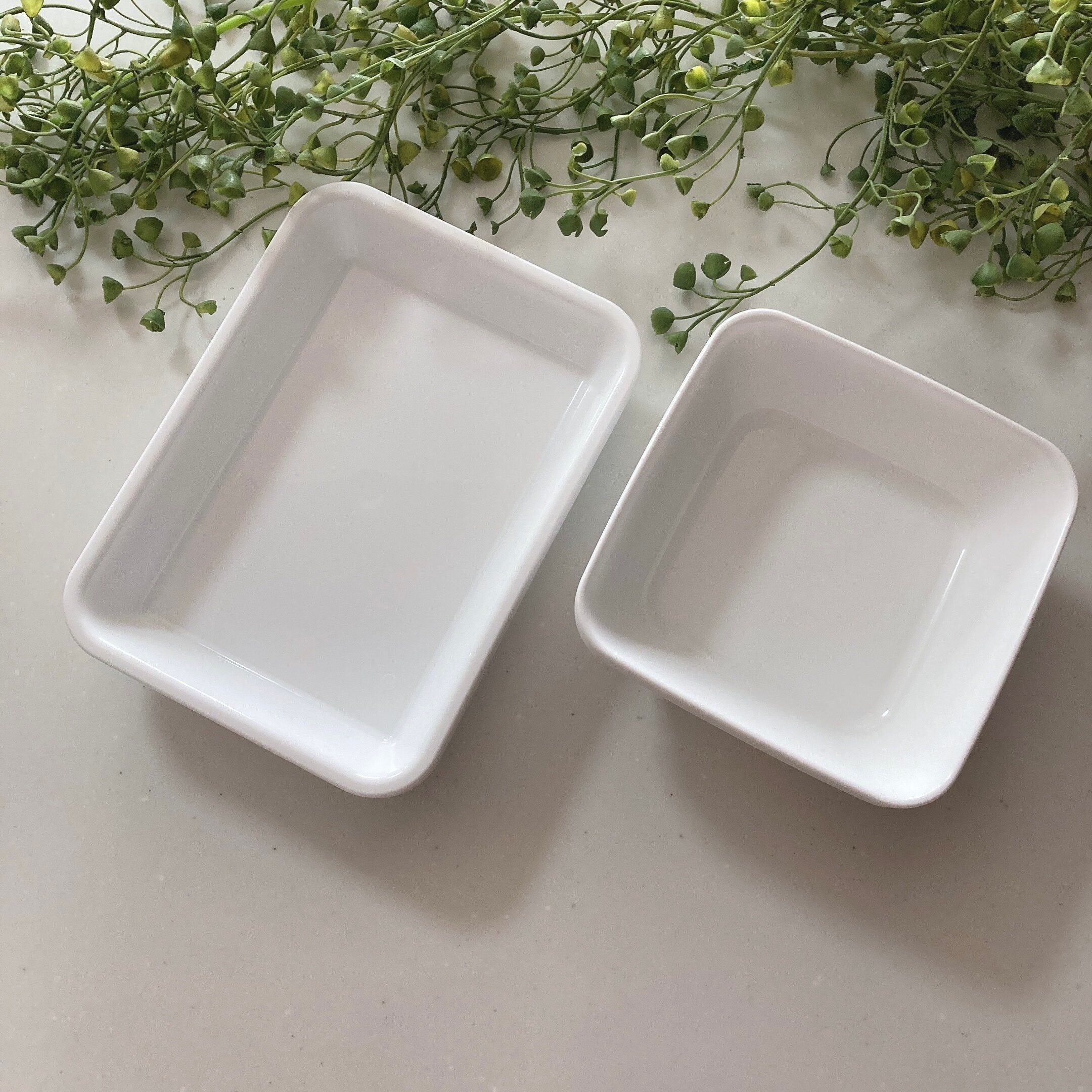 ちなみに、セリアには正方形タイプの「お料理小皿角4枚セット」もあり、こちらもおすすめです。4枚セットで110円なのでコスパ良しの商品ですよ。