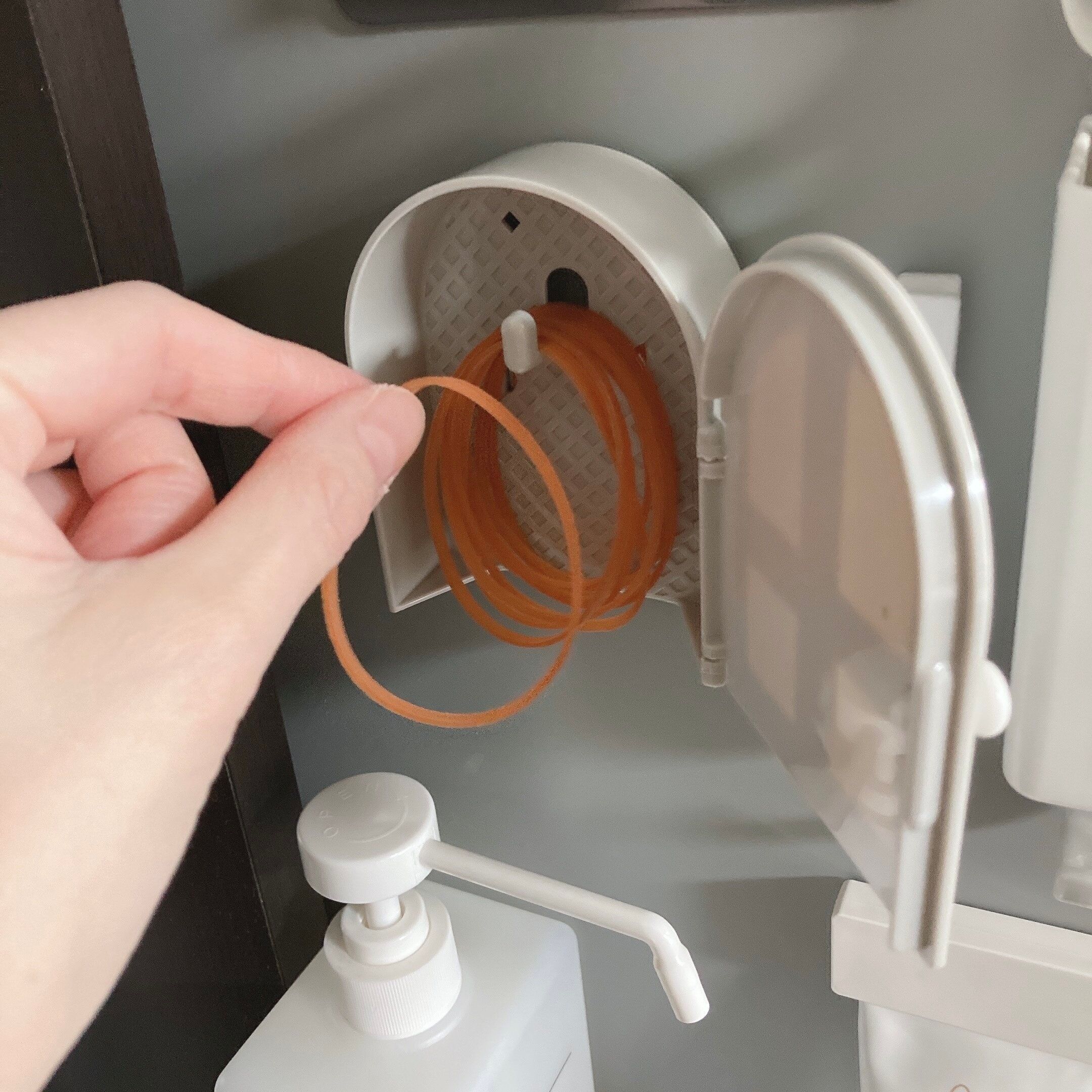 商品名のとおり、扉を開けるとフックがあり輪ゴムをひっかけることができるようになっています。