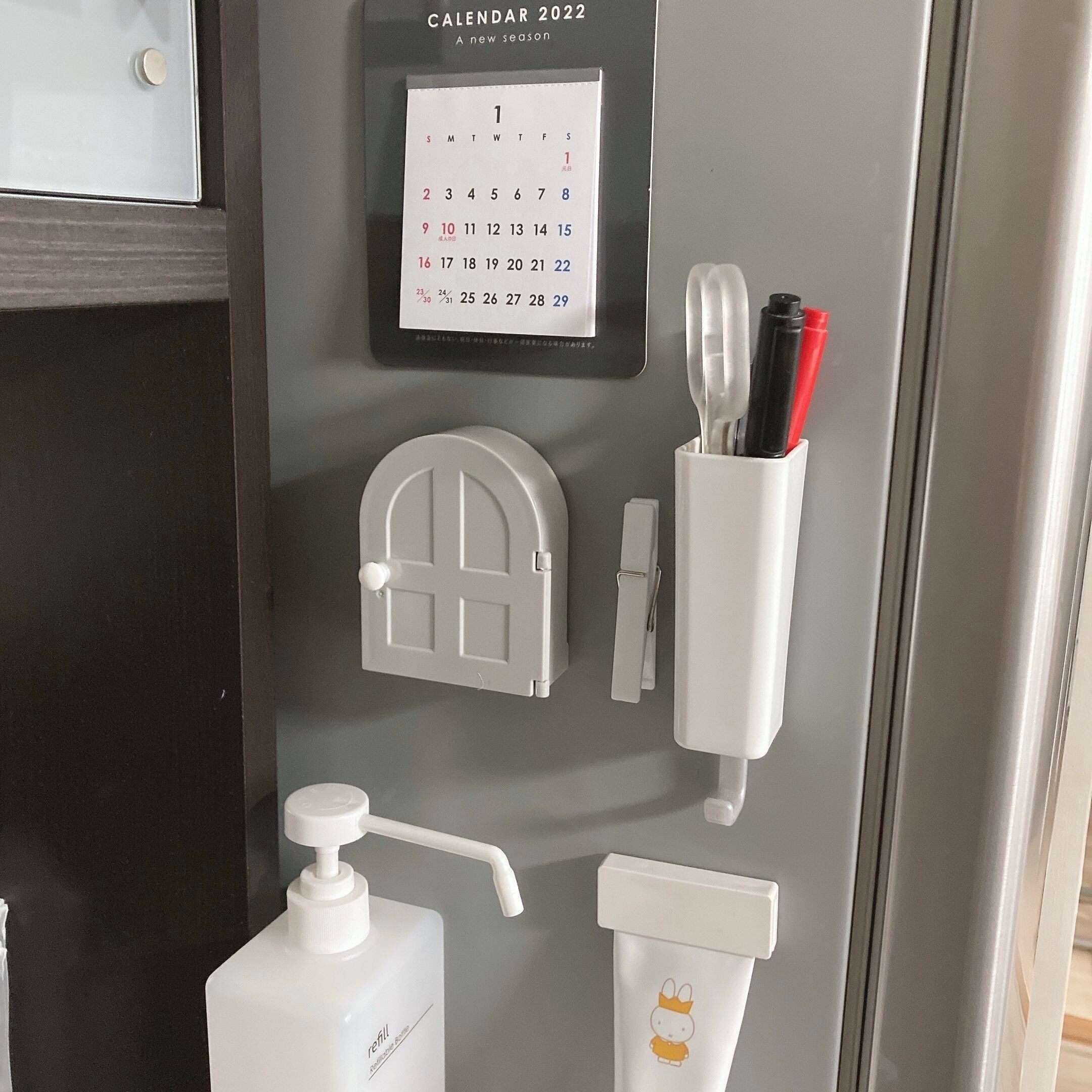 キッチンのほかにも玄関ドアにペタッとはりつけて、カギを収納しても。
