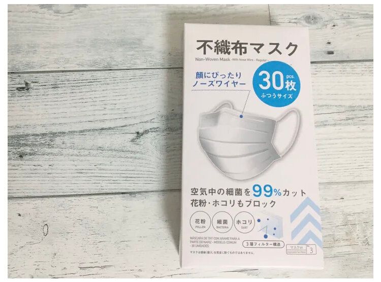 毎日使うマスクはコスパ重視!という人におススメなのが「不織布マスク 30枚」(110円)。30枚で110円というコスパの良さは右に出る者はいないといっても過言ではないDAISOの大ヒット商品です。