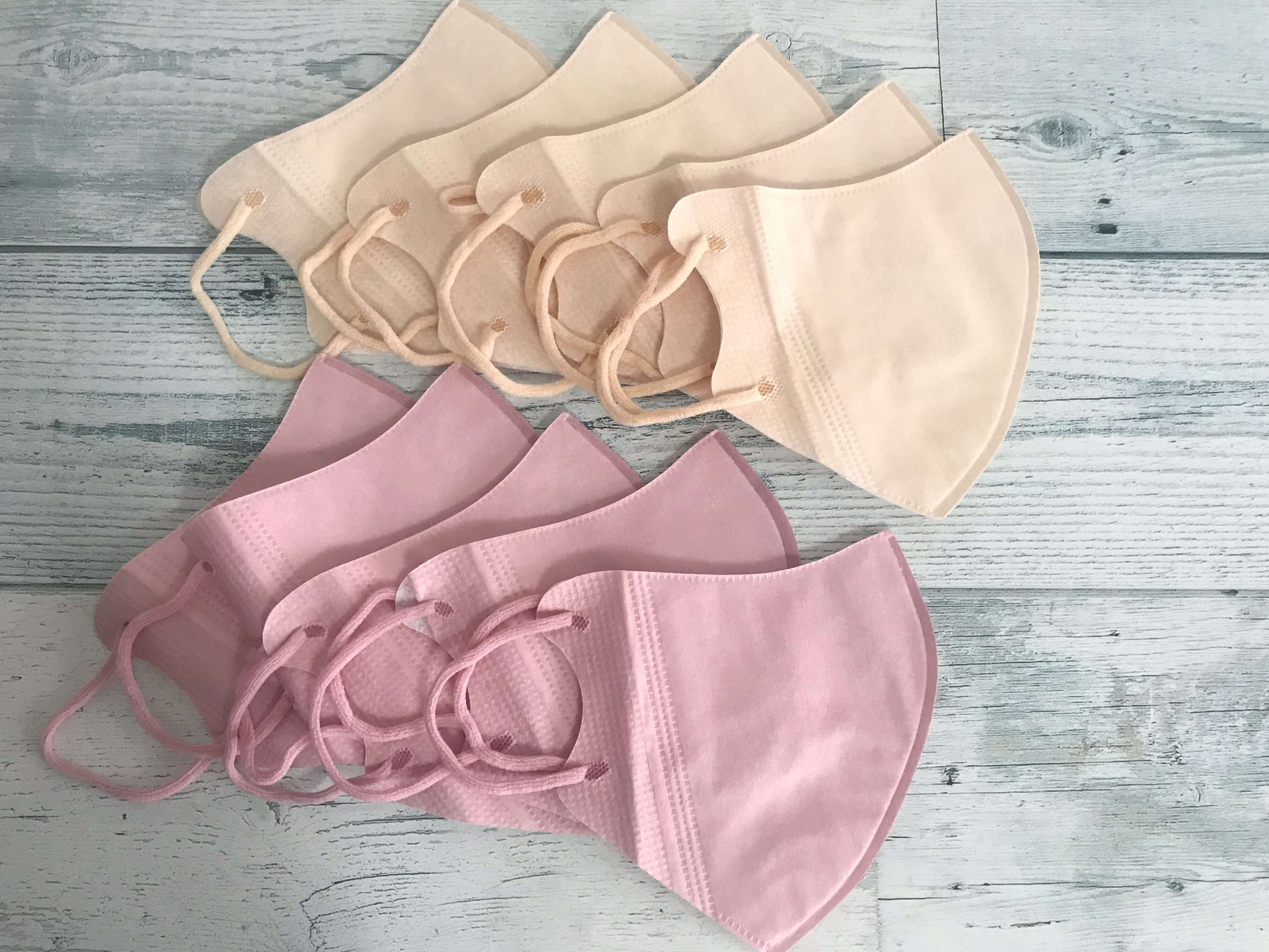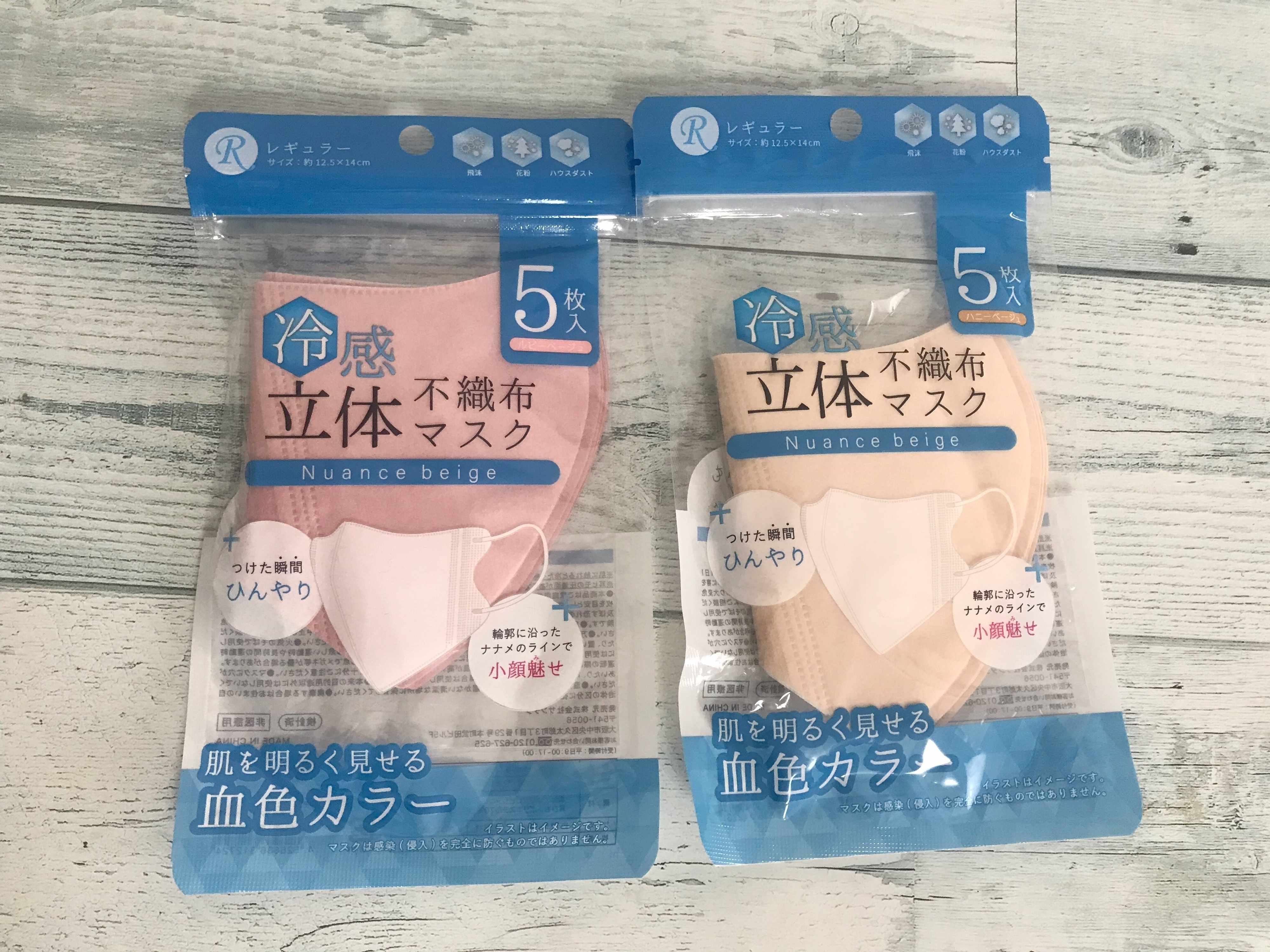 DAISOで発売されている「冷感 立体不織布マスク」(5枚入り・110円)。ルビーベージュとハニーベージュ2色購入してみました。どちらも肌を明るく見せてくれる女性に人気の血色カラーです。