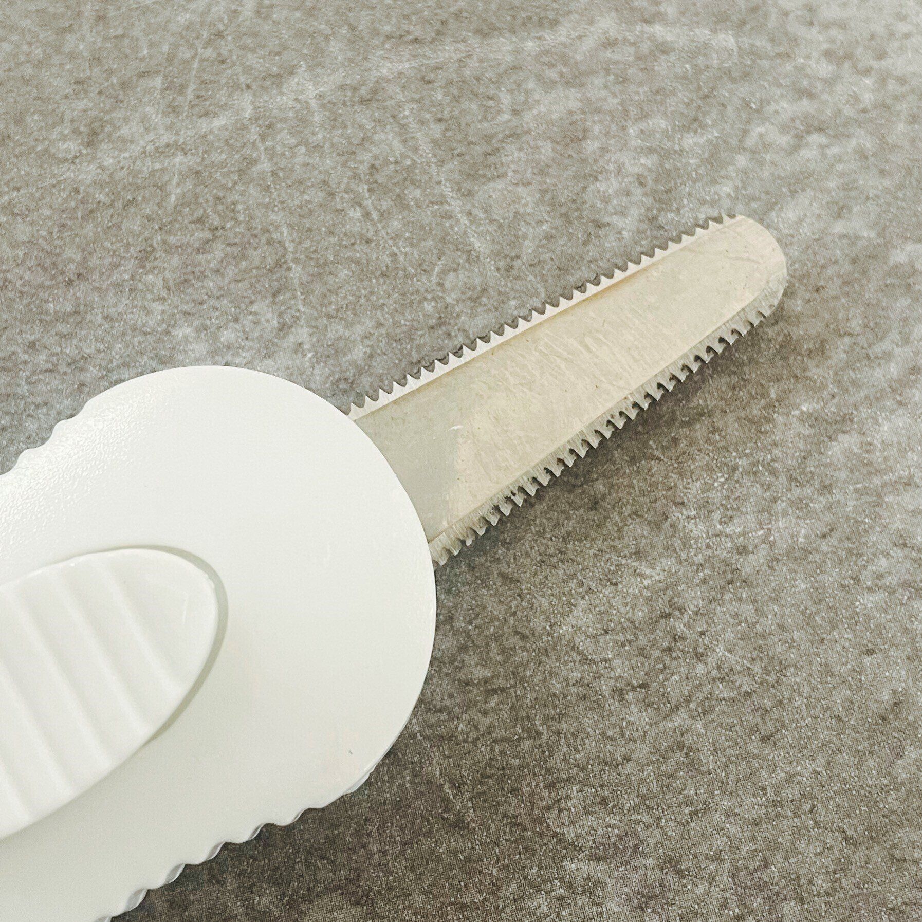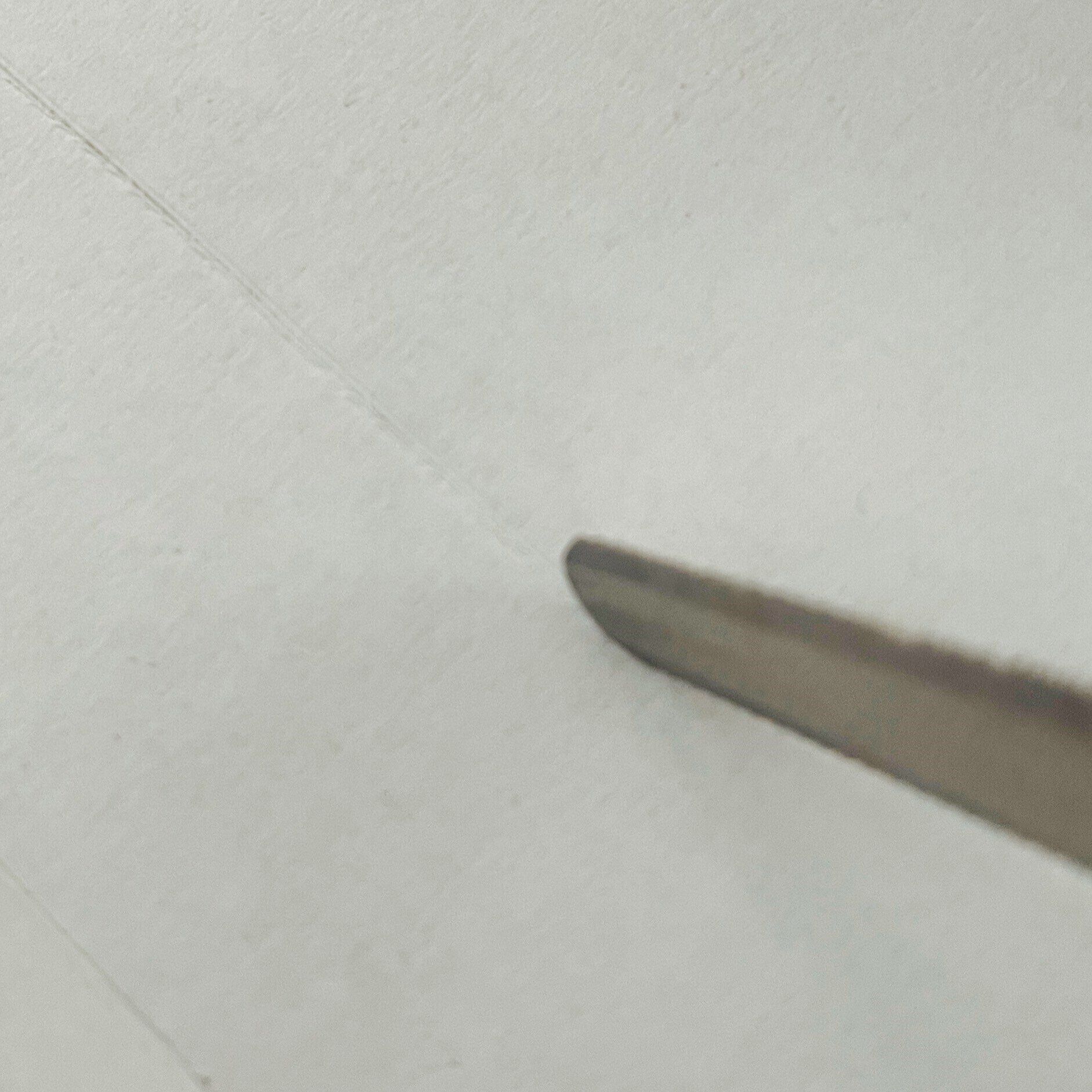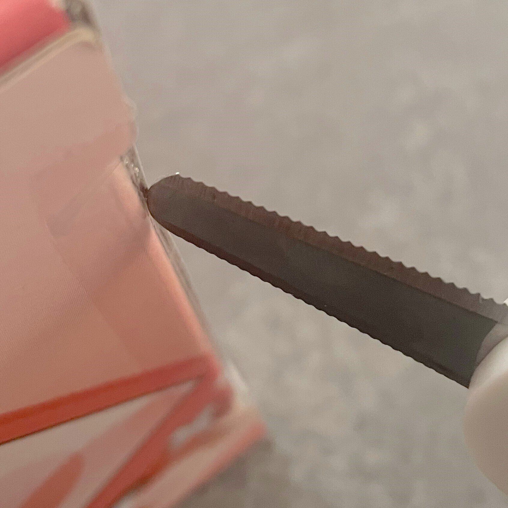 つまみを合わせてストッパーを解除し溝に沿ってつまみをスライドさせると刃が出てくるのですが、ふつうのカッターの刃とはまったく違う刃が出てきました!