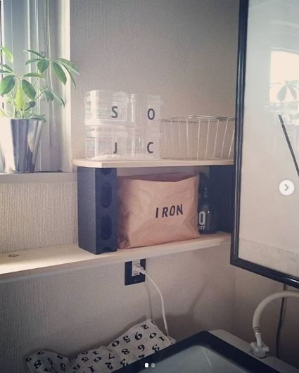 ペーパーバッグの中にはアイロンを収納。生活感が出なくなり、とても素敵なアイデアですね。バッグに貼ってあるアルファベットのシールは、キャンドゥのもの。頭文字だけを容器にする使い方もおしゃれ。見た目もわかりやすく、スタイリッシュです。