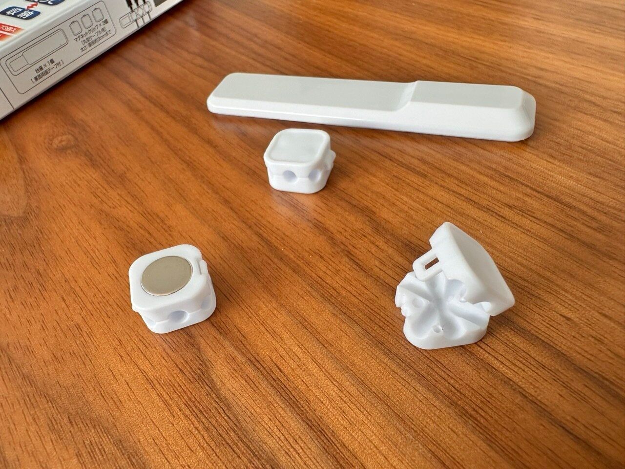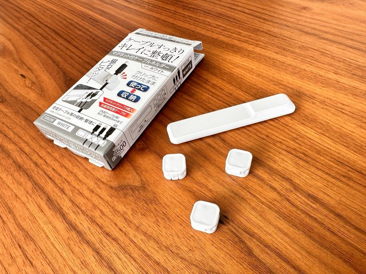 商品は100円ショップのキャンドゥ『マグネット付きケーブルホルダー』です。裏面両面テープ付きの台座が1つとマグネットクリップ3個がセットになっていますよ。ケーブルをすっきりとキレイに整頓することができる便利アイテムになっています。