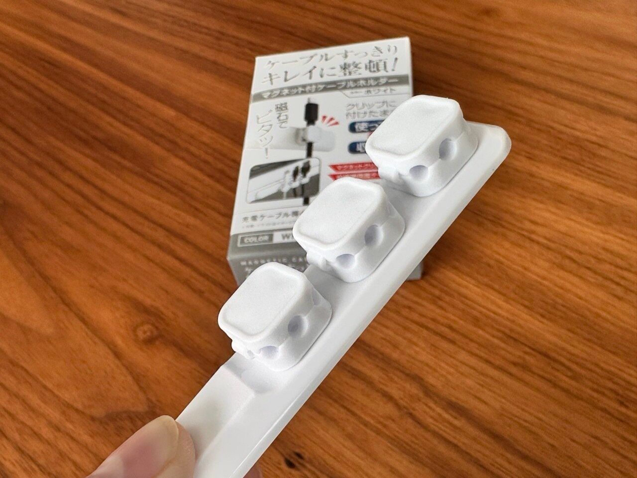 クリップは片方が開くようになっていて、クリップには小さな穴と大きな穴の2種類あり、ケーブル(丸型ケーブル用で、太さ直径約3mmまで)を挟んで留められるようになっています。裏には磁石が付いていますよ。