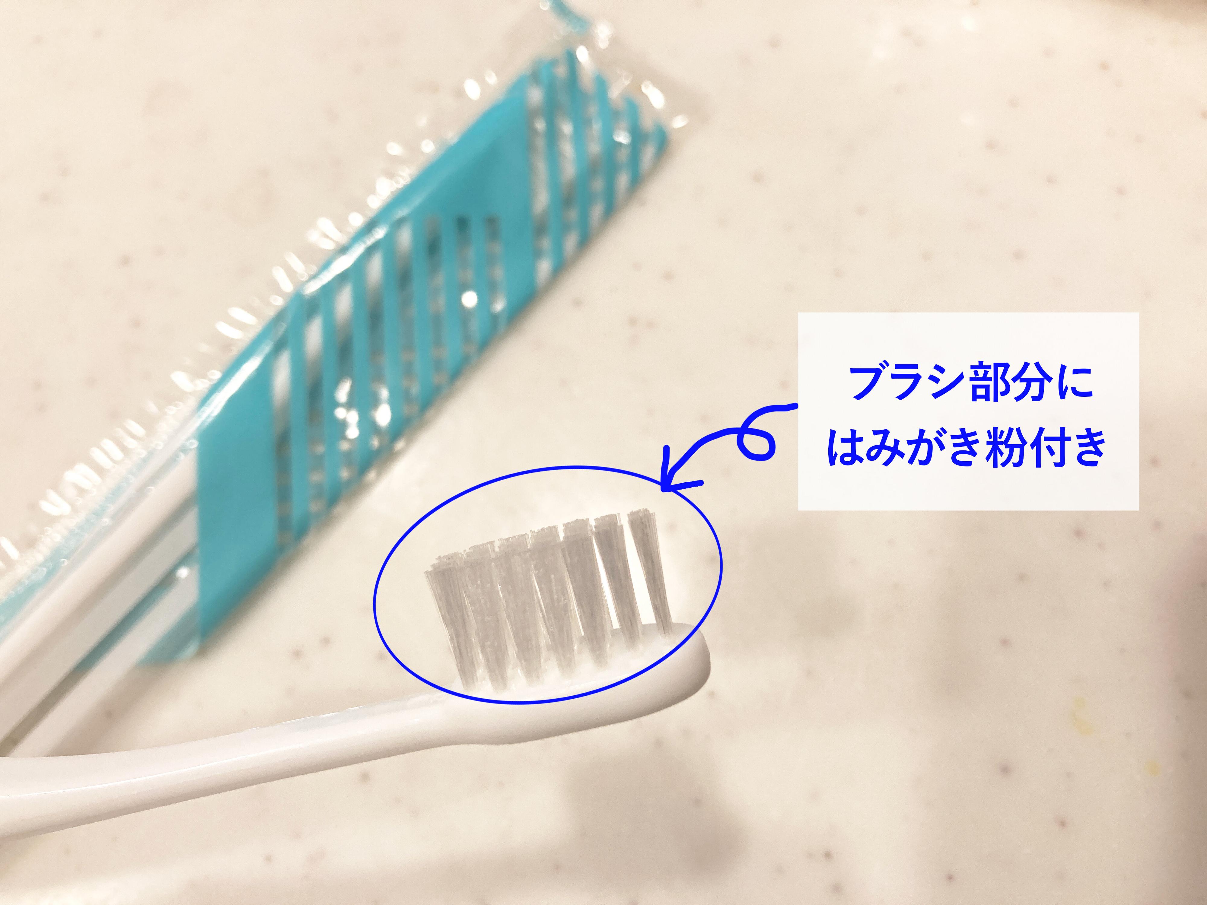 セリアで見つけた「はみがき粉付き歯ブラシ」なら、はみがき粉がブラシ部分についているので、軽く水にぬらすだけで簡単に使用できてとても便利です。