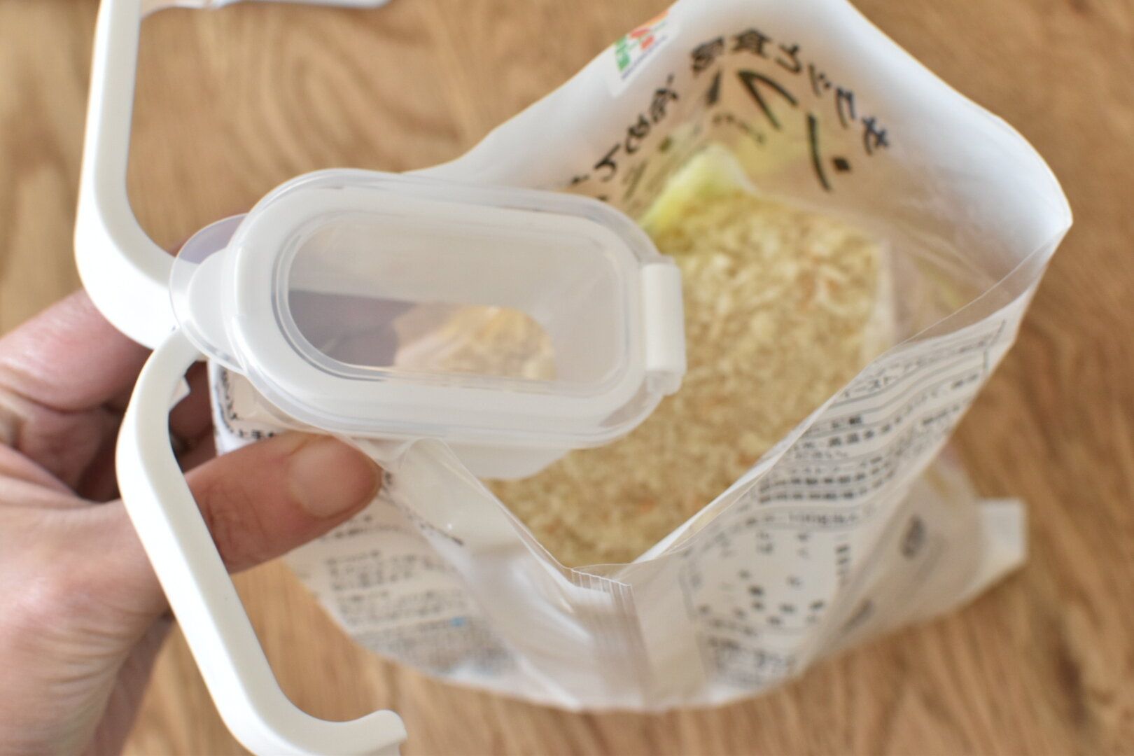 パン粉を容器に詰め替えて使用する場合、容器を洗う手間がかかりますよね。この「注ぎ口付き袋クリップ」は袋のままで使うことができるので、小さな家事の負担を減らすことができます。また、調理中でも片手でフタの開け閉めができ、好きな量を取り出すことができます。