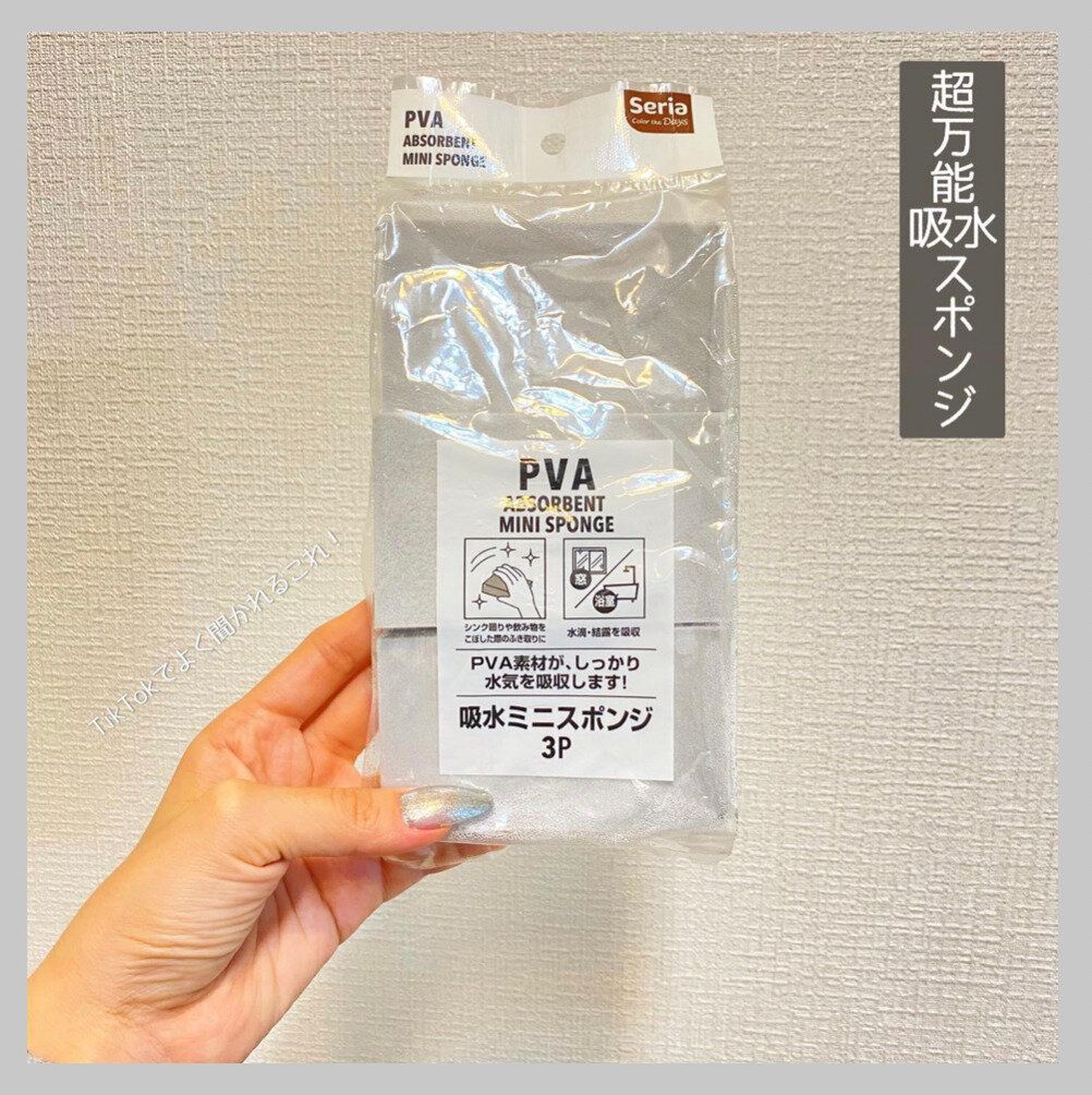 キッチンリセットや洗面台、お風呂のお掃除に便利なのが、こちらの吸水スポンジです。PVA素材がしっかり水気を吸収するので、拭き上げに使うことで水滴がなくなります!これで水回りの水垢問題にもさよならできますね。110円で3個入りなのもうれしいポイントです。