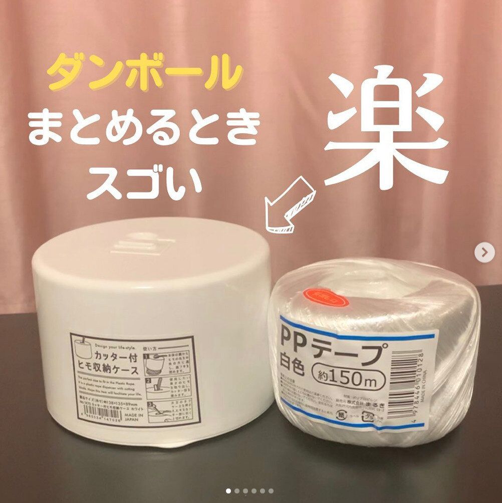 ダンボールをまとめるときに使うPPテープ。いざ使おうとしたら絡まっていたり、端が見つからなかったり、ちょっとしたストレスも多いですよね。そんなときはこちらのカッター付ヒモ収納ケースがおすすめです。ケースにカッターがついているため、ハサミやカッターを別で準備しなくてもいいのが便利ですね。カッター部分に紐の切り口が止まってくれるので、次に使うときもすぐに使えますよ。