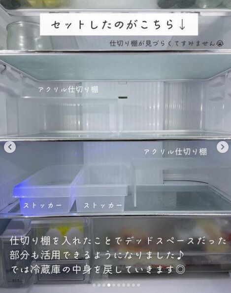 ごちゃごちゃしてしまいがちな冷蔵庫の中も、ダイソーの「キレイストッカーワイド」を使えば、スペースも有効活用できてスッキリ。納豆や調味料など、細かい物をまとめて入れておくことも可能です。無印良品などで売られている「アクリル仕切り棚」なども一緒に活用すると、より使いやすくなりそうですね。
