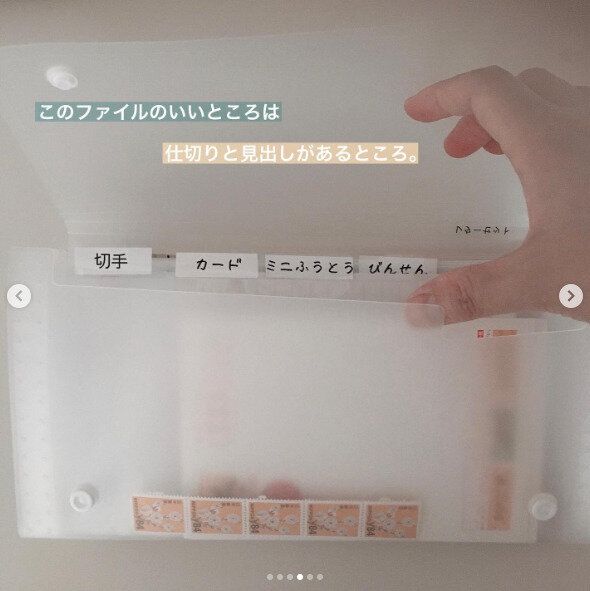 バラバラになってしまいがちな切手やカード、レターセットなどをダイソーのセクションファイルに収納している例です。このファイルは仕切りがつき、見出しもあるので、種類別に収納するのにとても便利。とても見やすくて使いやすそう!