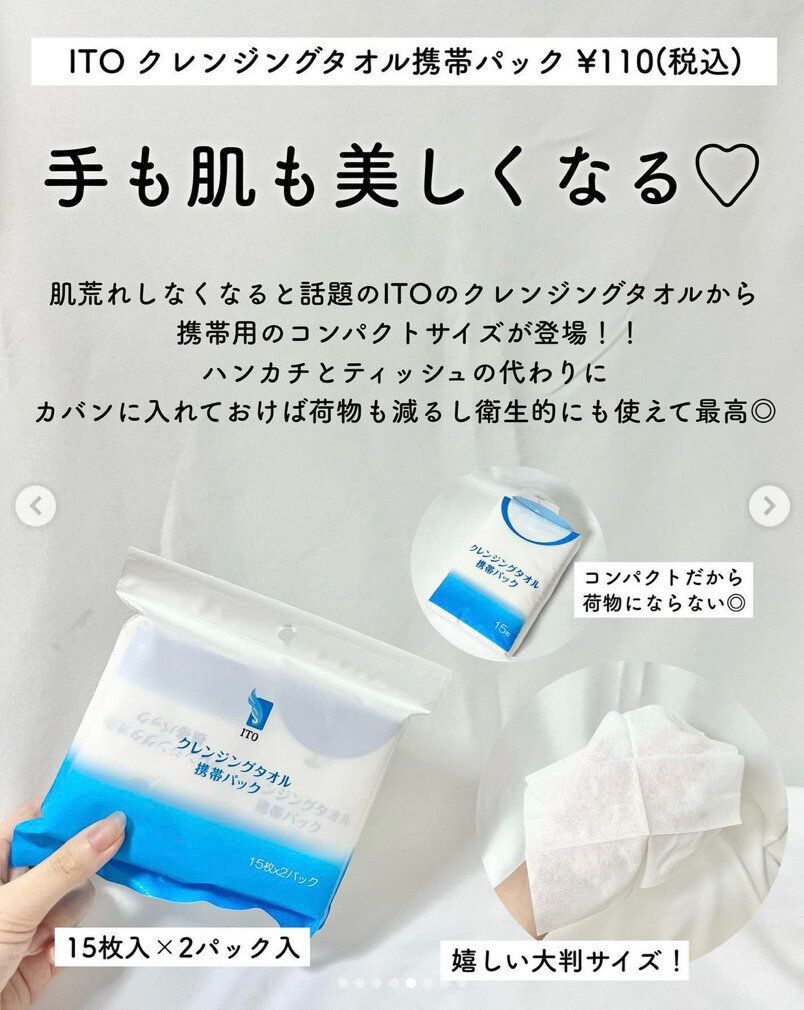 洗顔後の拭き取りやパッティング、マニキュア落としなど多用途に使えて、肌荒れしなくなると話題のITOクレンジングタオル。ダイソーでは携帯用のコンパクトサイズが110円で買えちゃいます。パッケージはコンパクトですが、広げると大判サイズなのもうれしいポイント。そして15枚が2パック入ってお得です!お出かけや旅行に、これがあれば安心ですね。