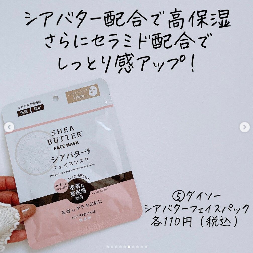 こちらはシアバター配合で、乾燥しがちな季節に使ってみたい高保湿タイプです。3枚入っていてコスパもいいですね。