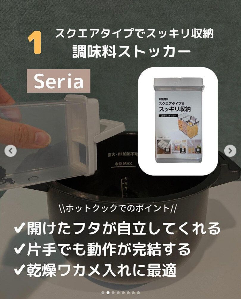 容量380mlでかさのあるものも入れやすい調味料ストッカー。こちらのアイテムは片手で簡単にフタが開けられ、開けたフタが自立してくれるのがポイント!傾けたときにフタが邪魔にならないのは、料理中だと結構な時短ポイントですよね。スクエアタイプなのでいくつか並べてもすっきりと見えるのがうれしいです。