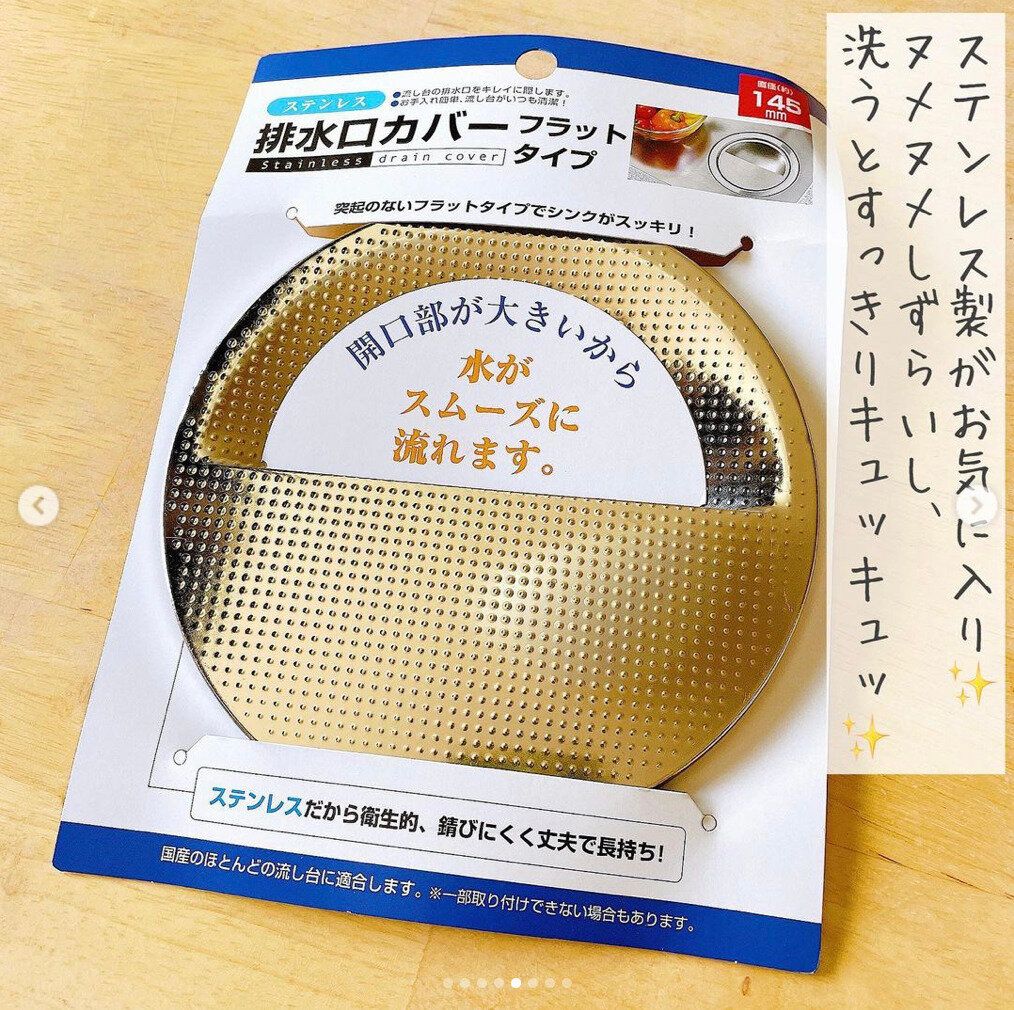 キッチンの排水口カバーはもともとついているものがありますが、汚れやすくぬめりやすいものだからこそ、100均で使いやすいものを購入して交換してしまうのがおすすめです。ステンレス製のものだとぬめりにくく、錆びにくいため衛生的に使えます。フラットタイプは開口部が大きく水が流れやすいのもいいですね。