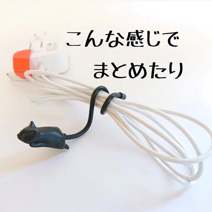 くねくねのしっぽで散らかりやすいコード類をしっかりまとめてくれます。くるくるとまとめるだけでとても簡単。黒猫さんがかわいくて癒されるので、これならコードが見えていても嫌な気になりません。
