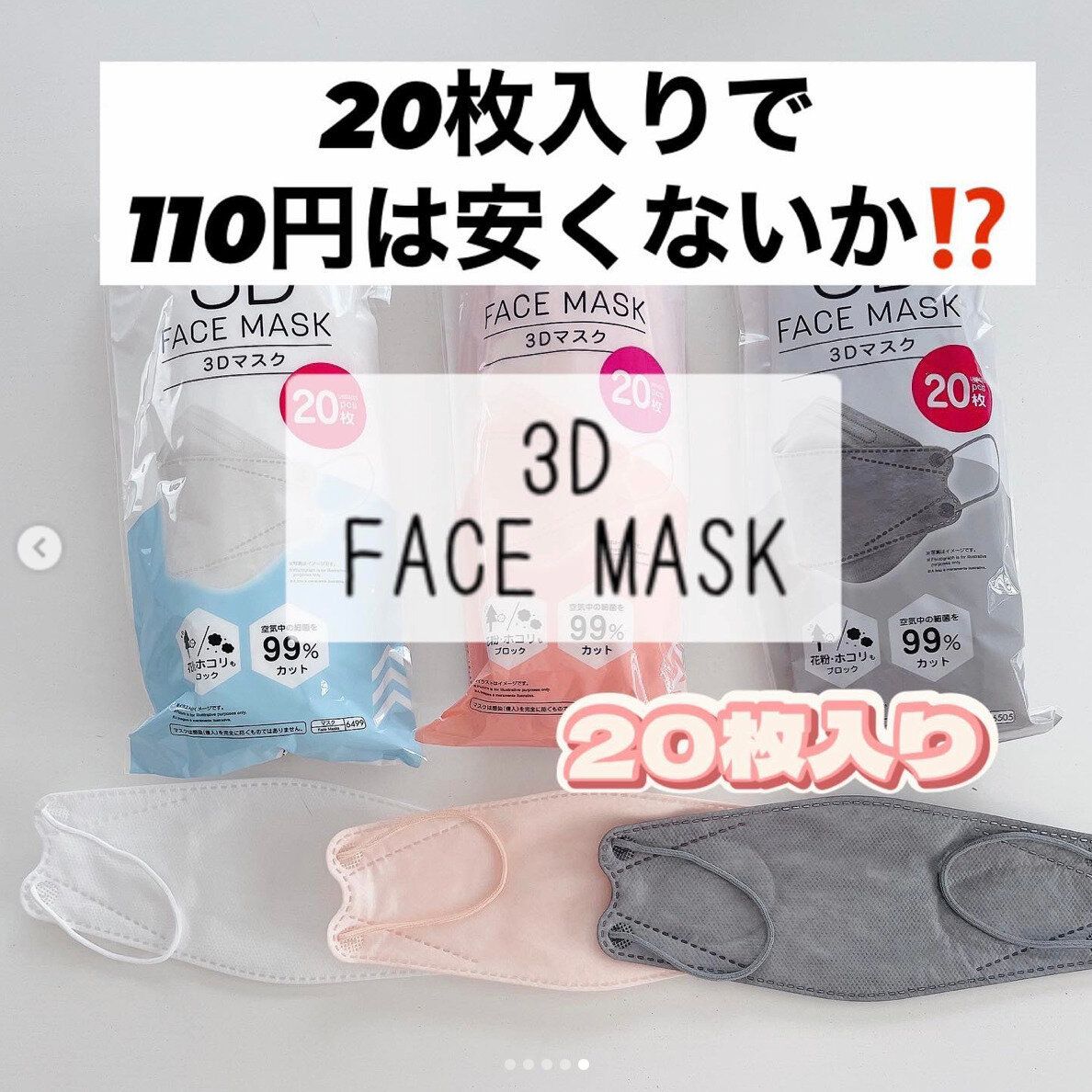 まだまだマスクが手放せませんが、ダイソーではなんと20枚入りが110円で買えちゃうんです!口元がくっつきにくい3D型のマスクが1枚約5円なんて驚きです。カラーもホワイト、ベビーピンク、グレーと、新色でピンクがあるようです。使いやすい色ばかりですね。