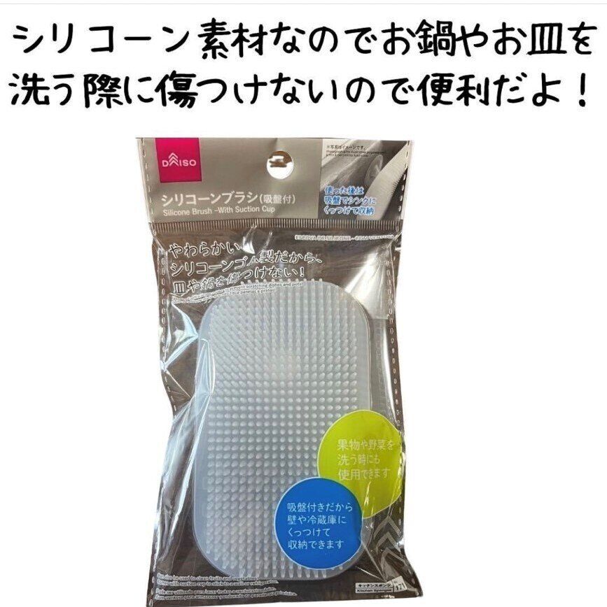 食器や鍋だけではなく果物や野菜も洗うことができる、実用性の高いアイテム「シリコーンブラシ」(110円)。柔らかいシリコーンゴム製のブラシなので、傷がつく心配がありません。さらに、吸盤つきなので収納場所にも困らないのもうれしいポイントです。