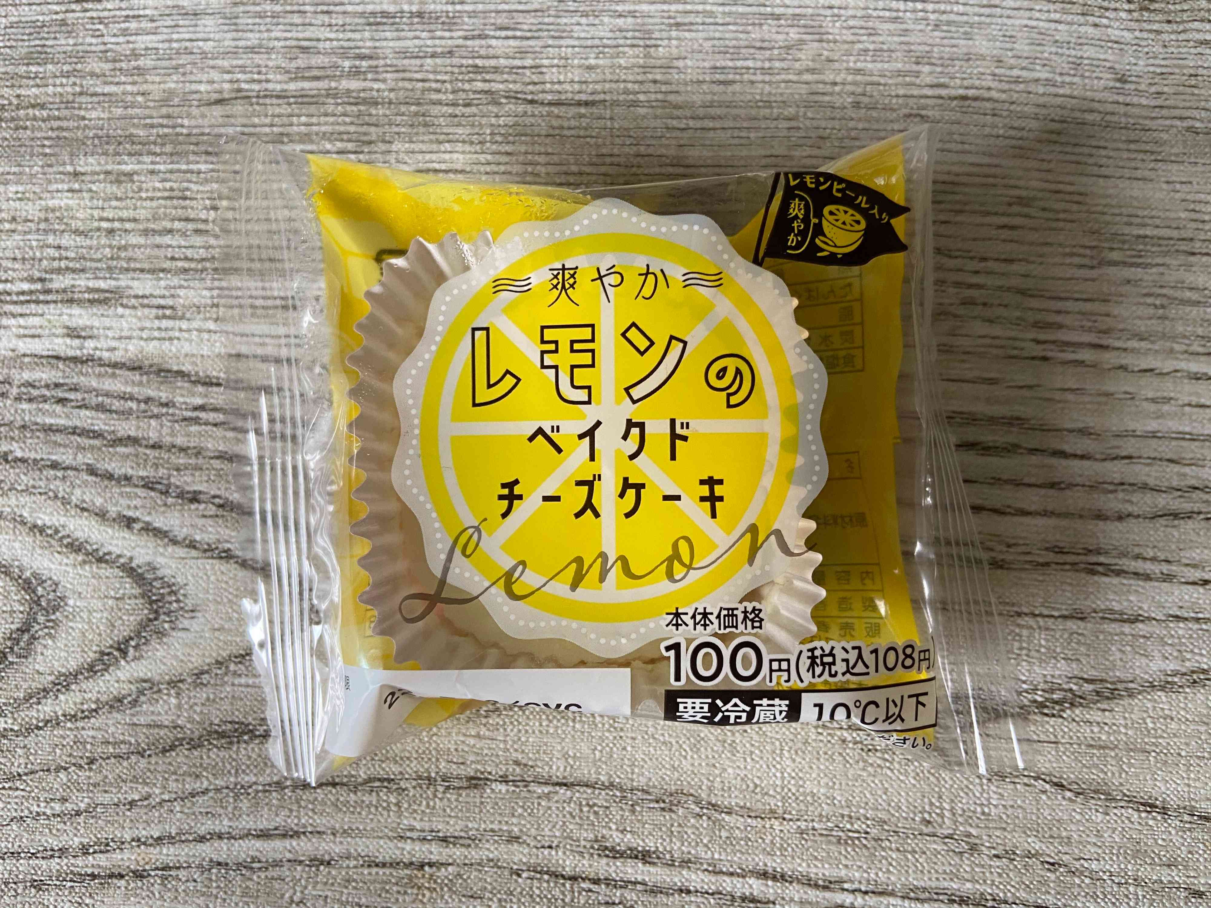 輪切りレモンのイラストが可愛い「レモンのベイクドチーズケーキ」(購入時:108円)。ローソンストア100で6月29日に登場したばかりの新商品スイーツです!