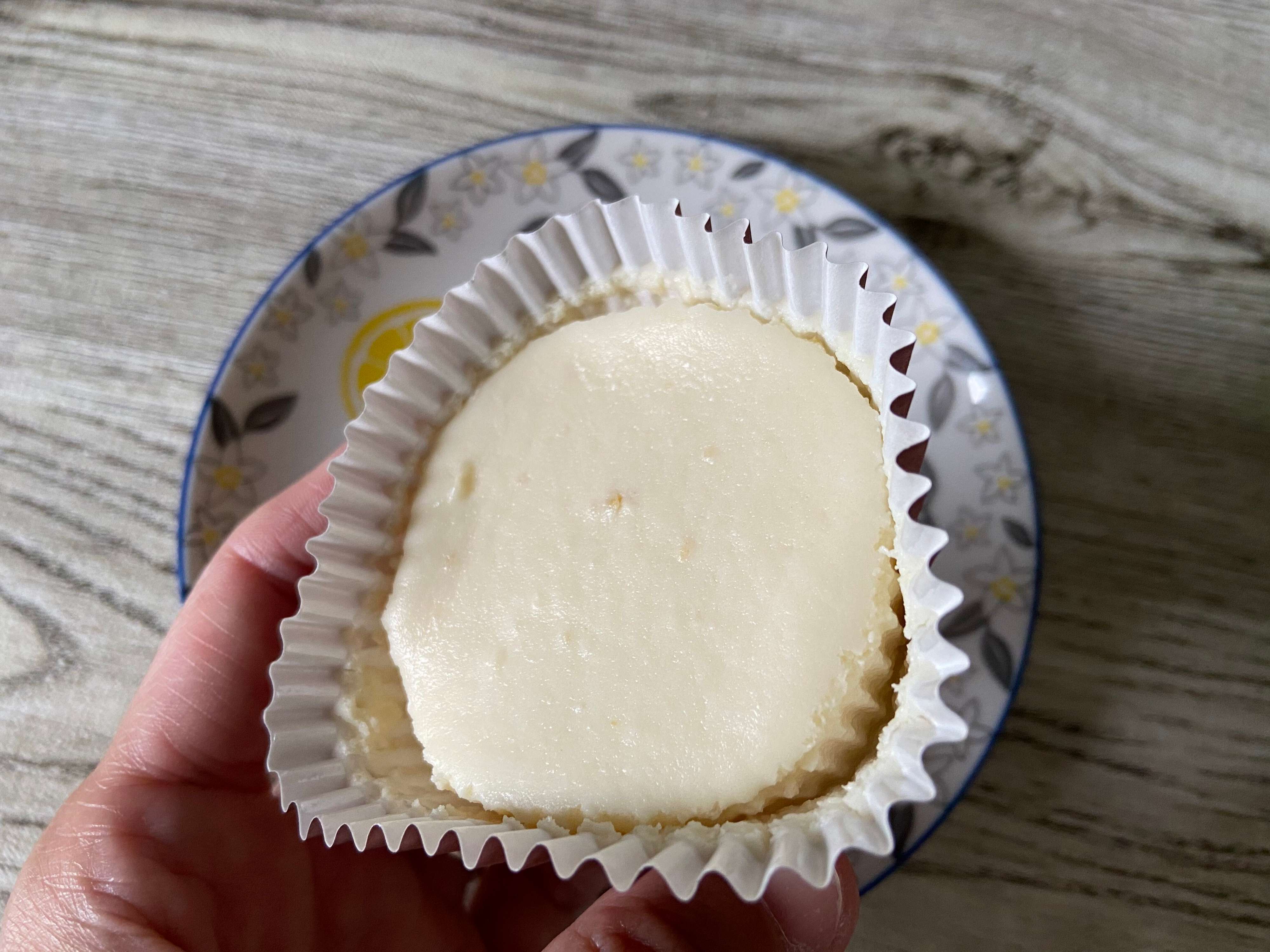 紙のカップに入った白いチーズケーキ、見た目はベイクドというよりもレアチーズのような雰囲気。