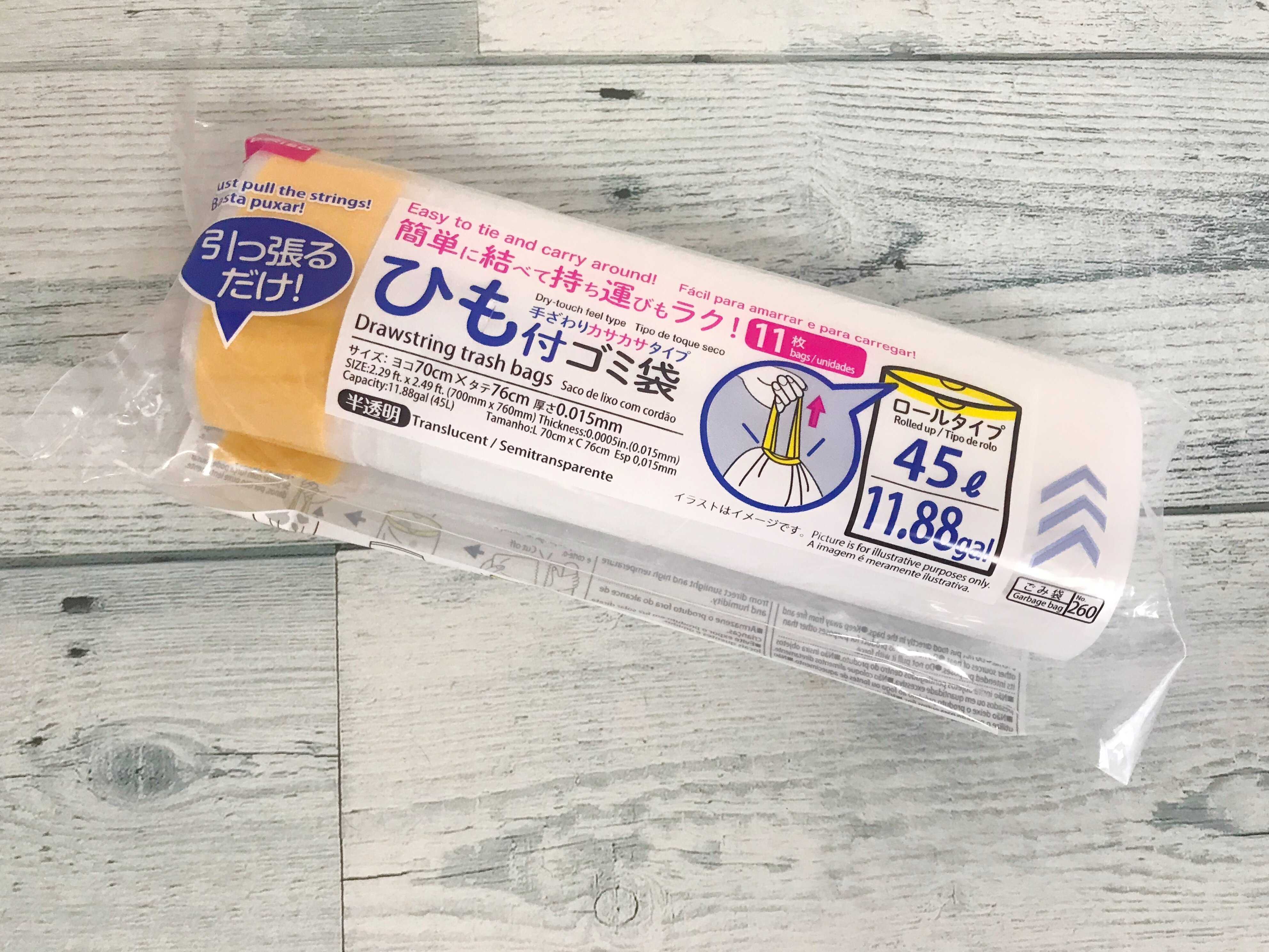 DAISOの「ひも付ゴミ袋」(110円)は内容量45Lの透明のゴミ袋が11枚入りのロールタイプ。ロールタイプのゴミ袋は枚数の割にコンパクトなので収納場所にも困らないというメリットがあります。