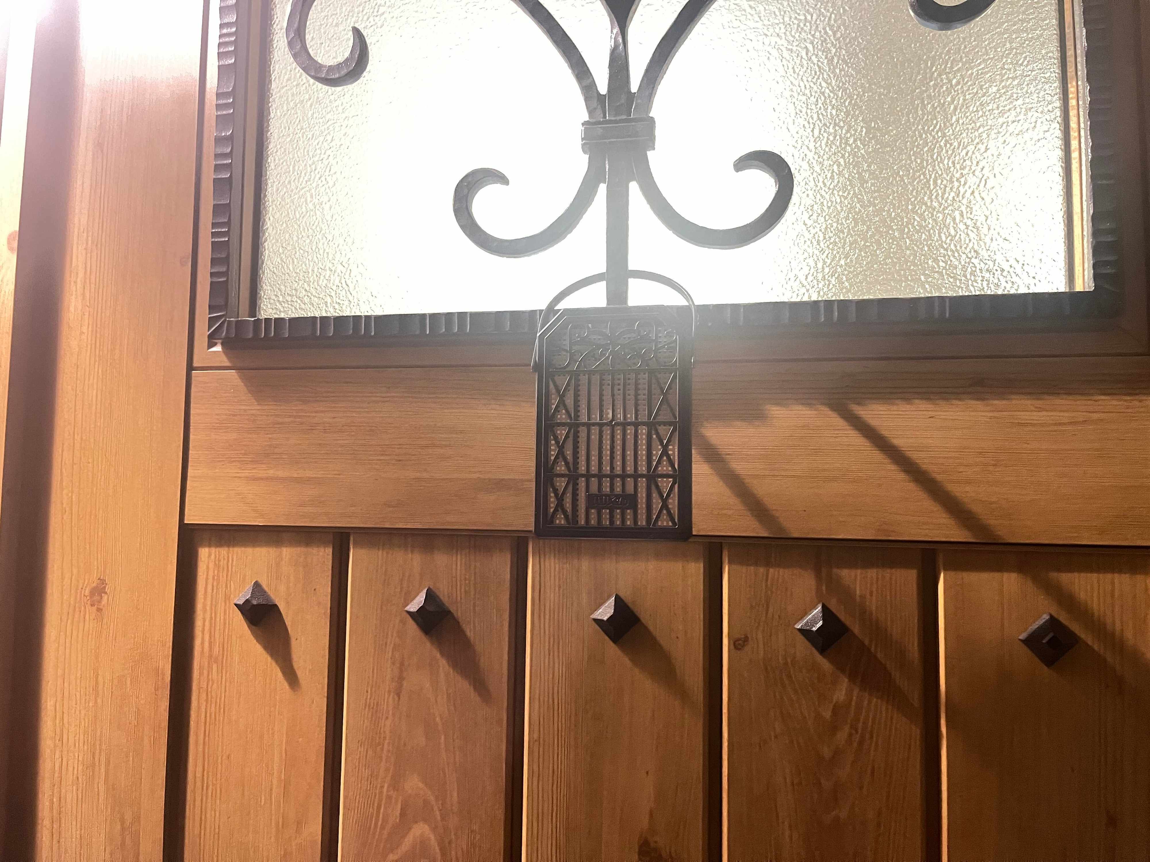 昨年までホームセンターで購入していた「ザ☆虫よけ」の外見と違い、アイアン調の落ち着いたデザイン。こちらも虫よけではなくても、玄関の飾りとして使ってよいのではと思うくらいのオシャレ度。袋から出して吊るすだけ。雨に濡れても大丈夫!との記載もありました。