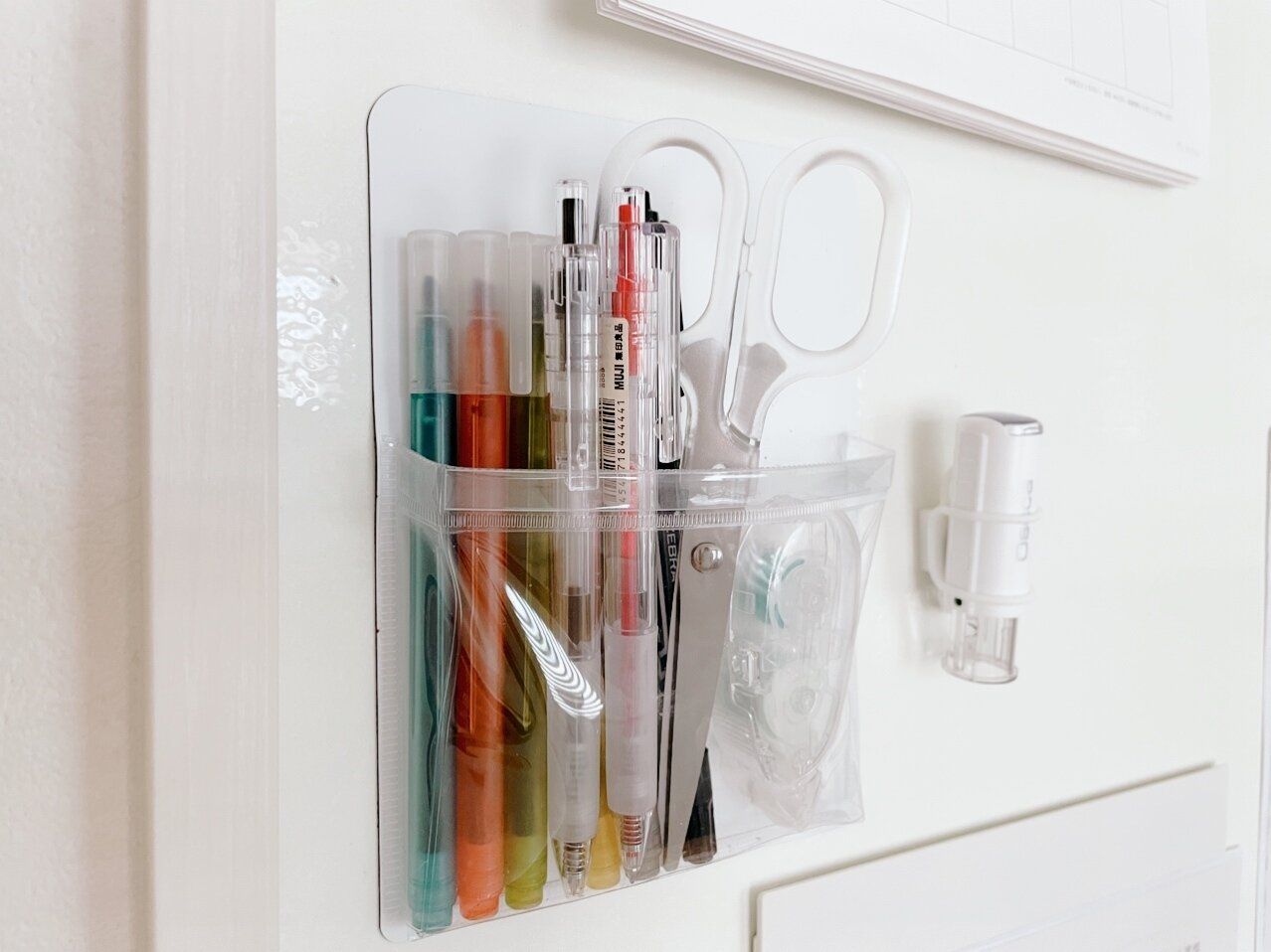 カレンダーやプリント類の近くに収納しているので、すぐに取り出して使えるのがとっても便利。出し入れが簡単なので戻し忘れることもありません。また中身が見てわかるので、家族から「あれどこ〜?」と聞かれることもなくなりますよ。