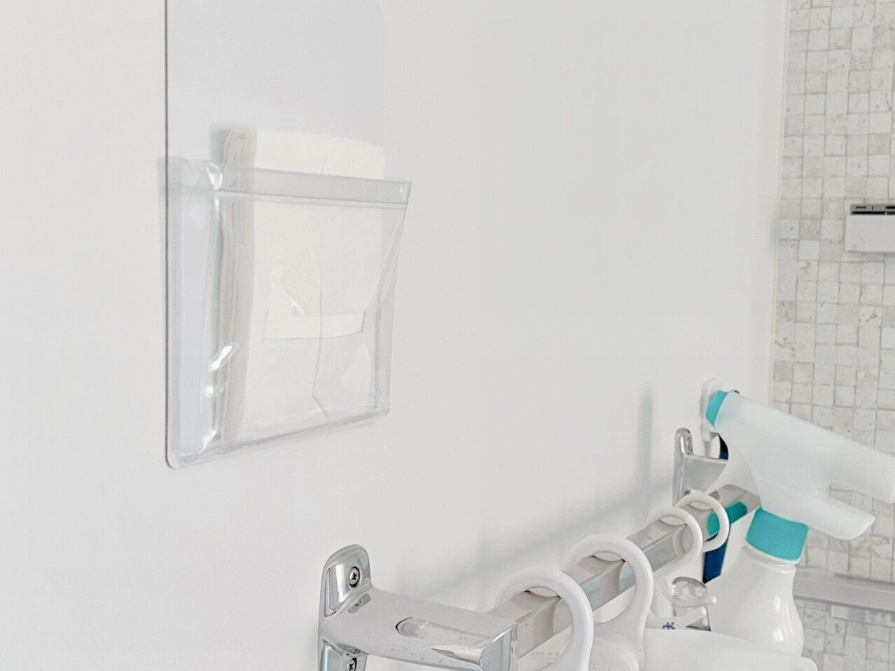 目に見える最短動線にセットすることでやり忘れを防ぎます。表面はホワイトでマチのビニールも透明なので壁面がごちゃついて見えることもありません。