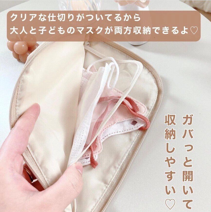 ポーチの中身は仕切りがついているので自分だけでなく、家族の分も収納しておけます。そしてうれしいのが、抗菌なこと!清潔な状態でマスクを持ち運べます。見た目もかわいらしいので、持ち運びしても邪魔になりません。