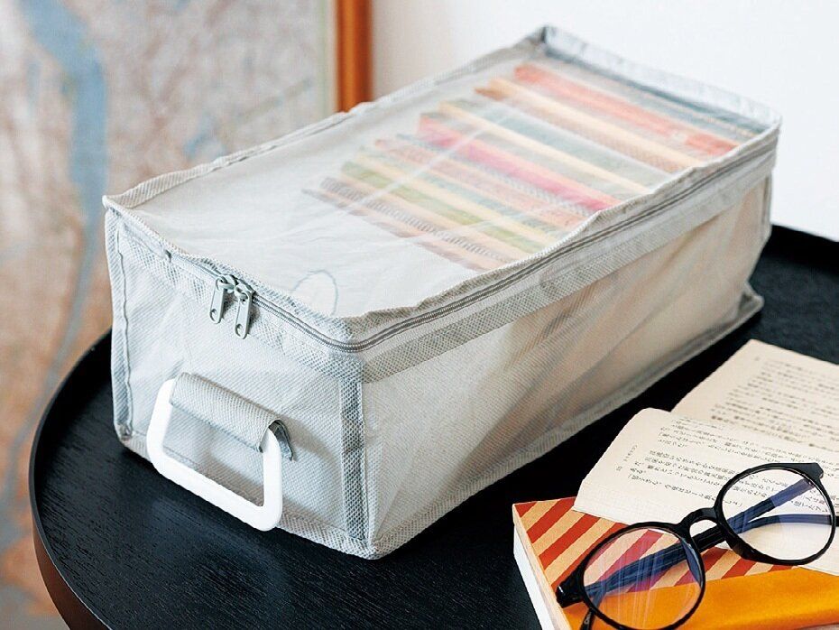 棚に並べるとバタバタ倒れがちな文庫本も、この収納袋にまとめればスッキリ!取っ手付きだから、移動もラクちん。透明窓で中身がすぐわかるのも好評ポイントです。