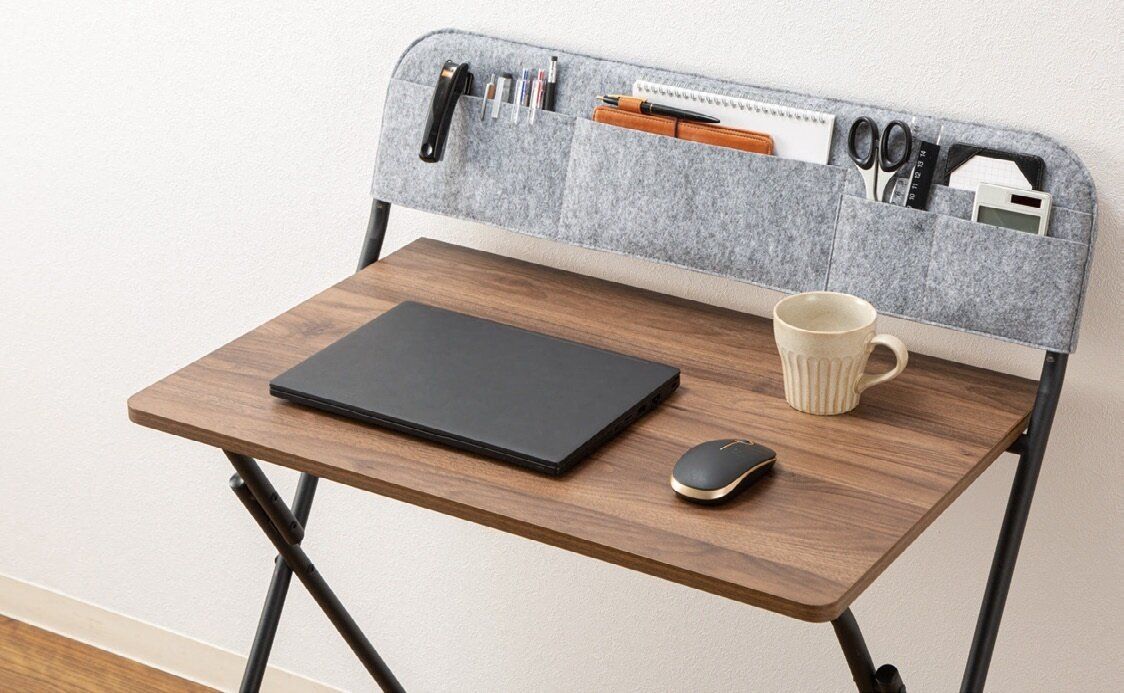 折りたたみ式で軽くて持ち運びやすいデスク。文具などを収納できるポケット付きで、収納したまま移動できるのが「ありそうでなかった!」と高評価を得ています。