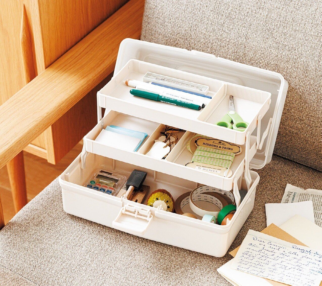 3段のスライド式で、収納力抜群。出し入れスムーズで、取り外しできる仕切り4本が付いて細かい物の収納にも。工具用、コスメ用、薬用と3つ愛用中です。(まるやまさん)