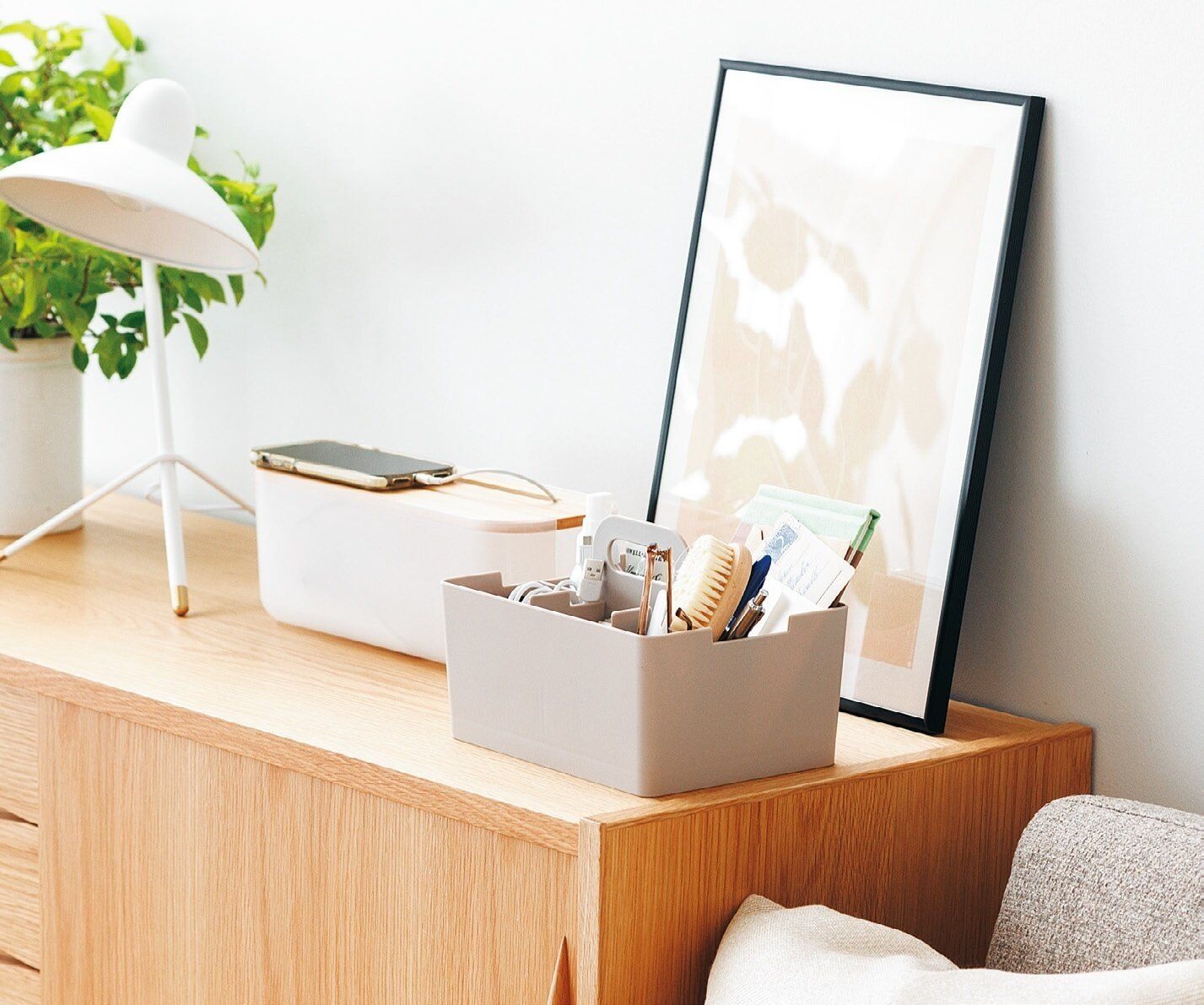 取っ手付きBOXは仕切りで中の幅を調整できて、細かい物をひとまとめするのにぴったり。ケーブル収納はフタがインテリアになじむ天然木で、電源周りがすっきり!(海老原さん)