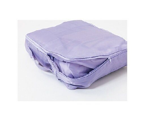 袋に入れた後、ファスナーを閉めるとコンパクトに。薄手のTシャツが20枚入る収納力!