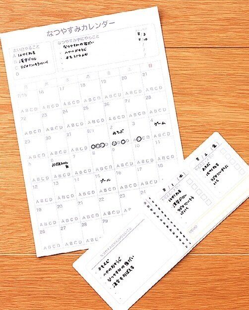 夏休みカレンダーと1日の予定を記せるノートのセット。目標を設定したり、親子で宿題の進み具合を共有できる。
