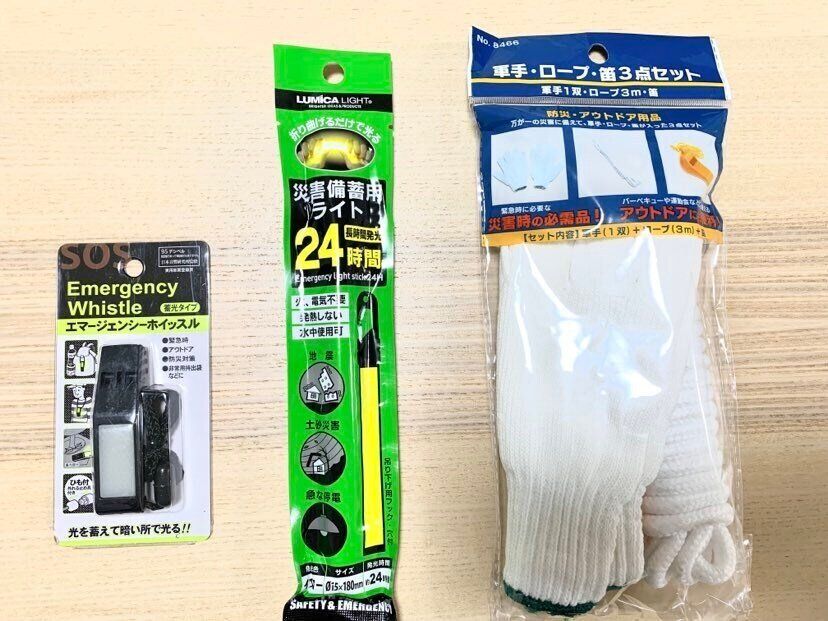 軍手やロープと笛が入ったセット。こういったものを使う日が来ませんようにと思いながら準備しました。備えてあると安心です。