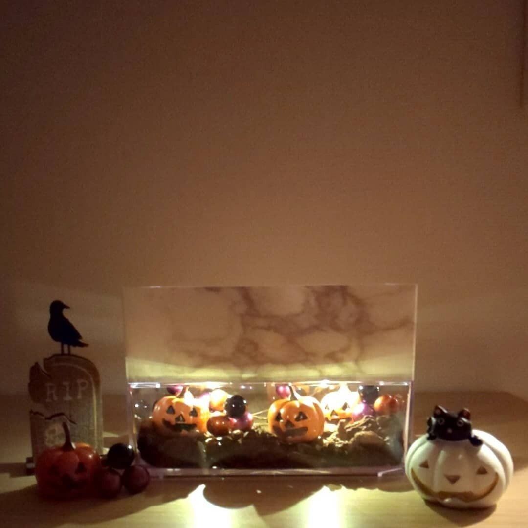 ソーラーガーデンライトと積み重ねられるPSクリアケース(2個入り)と季節のディスプレイアイテムを使って、ディスプレイケースをDIYするアイデアです。下のクリアケースにディスプレイアイテムを入れて、上に重ねたクリアケースにはリメイクシートを貼りつけてからソーラーガーデンライト上部を入れます。イベントごとにディスプレイアイテムを変えても楽しいですね。