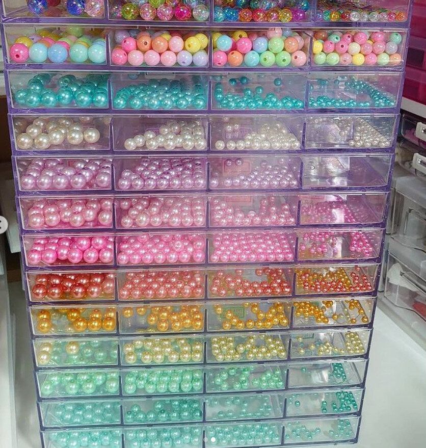 PSクリアケースは、ハンドメイドのパーツやビーズの収納にも重宝します。フタがないので引っかかってこぼれる心配もなし。ケースの中身が見えるので、どこにどのパーツが収納されているか分かりやすいのもポイントです。このようにサイズや色ごとに分けて収納すれば、見た目も鮮やかで素敵です。
