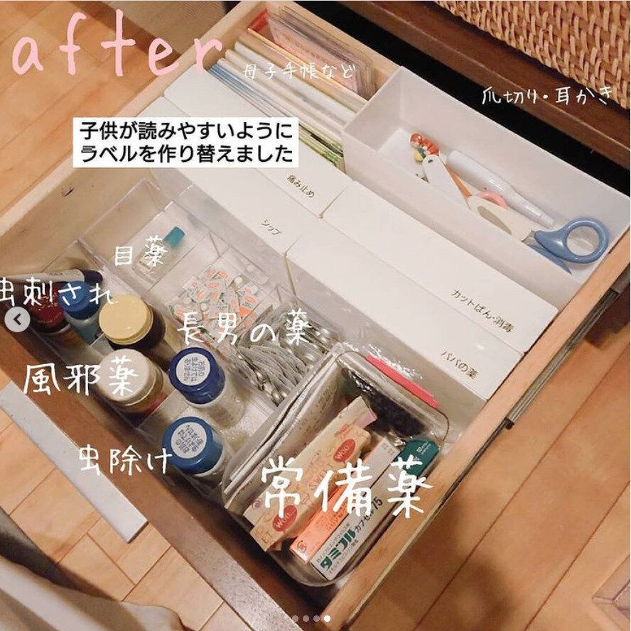 こちらはリビングのテレビラックの引き出し収納アイデアです。分割タイプのPSクリアケースを使えば、引き出しの空きスペースも有効活用できますよ。風邪薬や虫よけ、目薬などのこまごまとしたお薬関係を分けて入れる際も便利。頻繁に使うものは手前に収納すると、取り出しやすくて助かります。