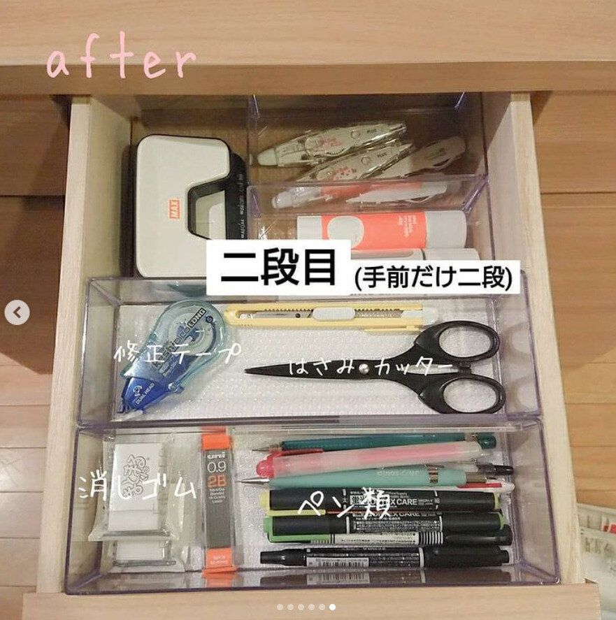 PSクリアケースを使って、はさみやカッターでひとまとまり、ペンや消しゴムでひとまとまり、といったようにジャンルごとに文具を収納するのもおすすめです。引き出しの中でどのようにレイアウトするかで取り出しやすさも変わるので、どこを積み重ねるか?というのもポイントですよ。
