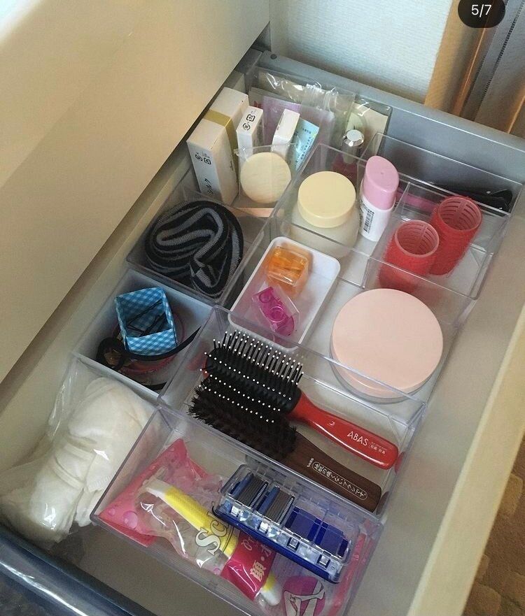 小物が多くなる洗面所の引き出しはごちゃごちゃしがちですよね。収納したいものに合わせて組み合わせてこのケースを使えば、きれいに整理ができます。