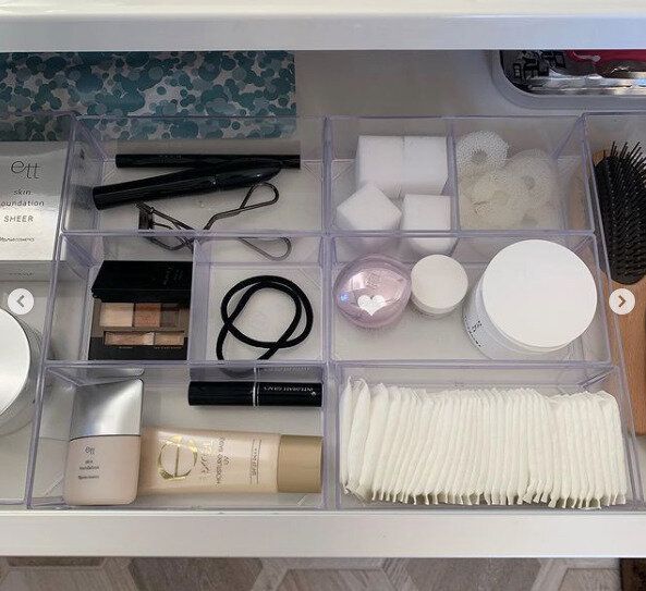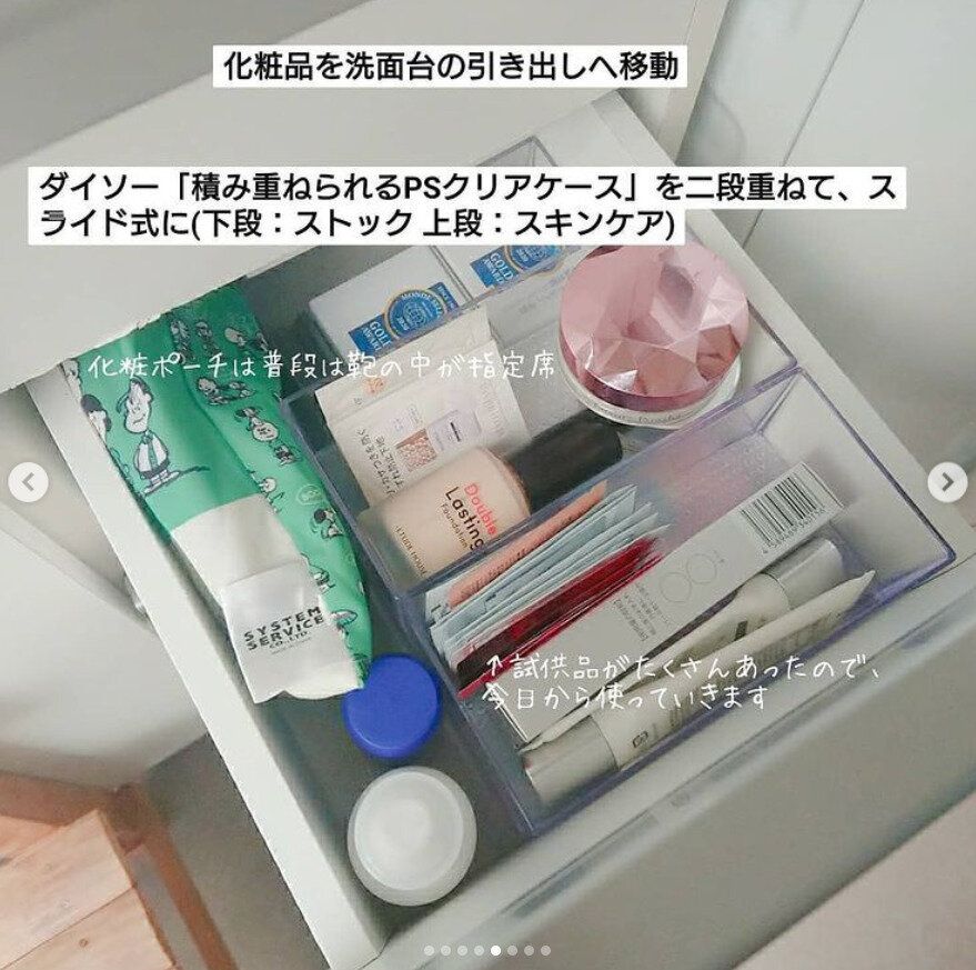 ダイソーのPSクリアケースは、スキンケアアイテムやメイク用品など、コスメ収納にも大活躍!引き出しにPSクリアケースをセットしておくと、何がどこにあるか一目瞭然。見つける手間が省けて使いたいアイテムをサッと取り出せるので、スキンケアやメイクを時短することができます。見た目もきれいで、引き出しを開けるたびにテンションがあがりますよ。