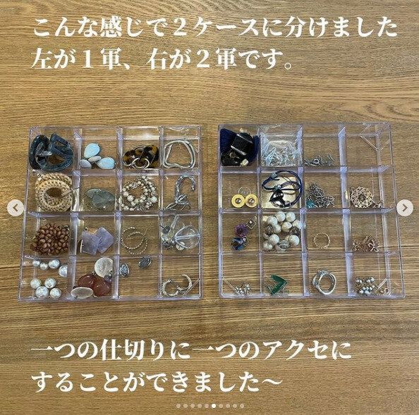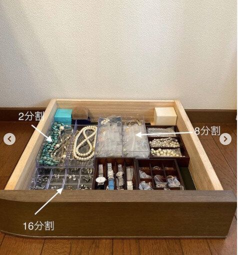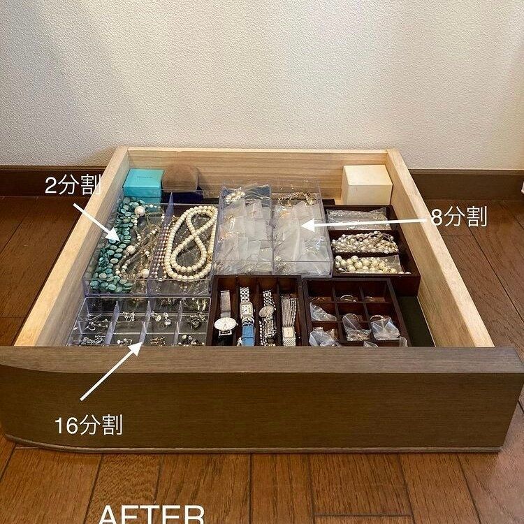 お気に入りのアクセサリーがこんな風に美しく並んでいるだけで気分があがりますよね。PSクリアケースを使ってアクセサリーを見事に収納したアイデア。アクセサリーの大きさに合わせて、16分割と8分割の4つのPSクリアケースを使用しています。引き出しの中で見事にシンデレラフィットしていますね!