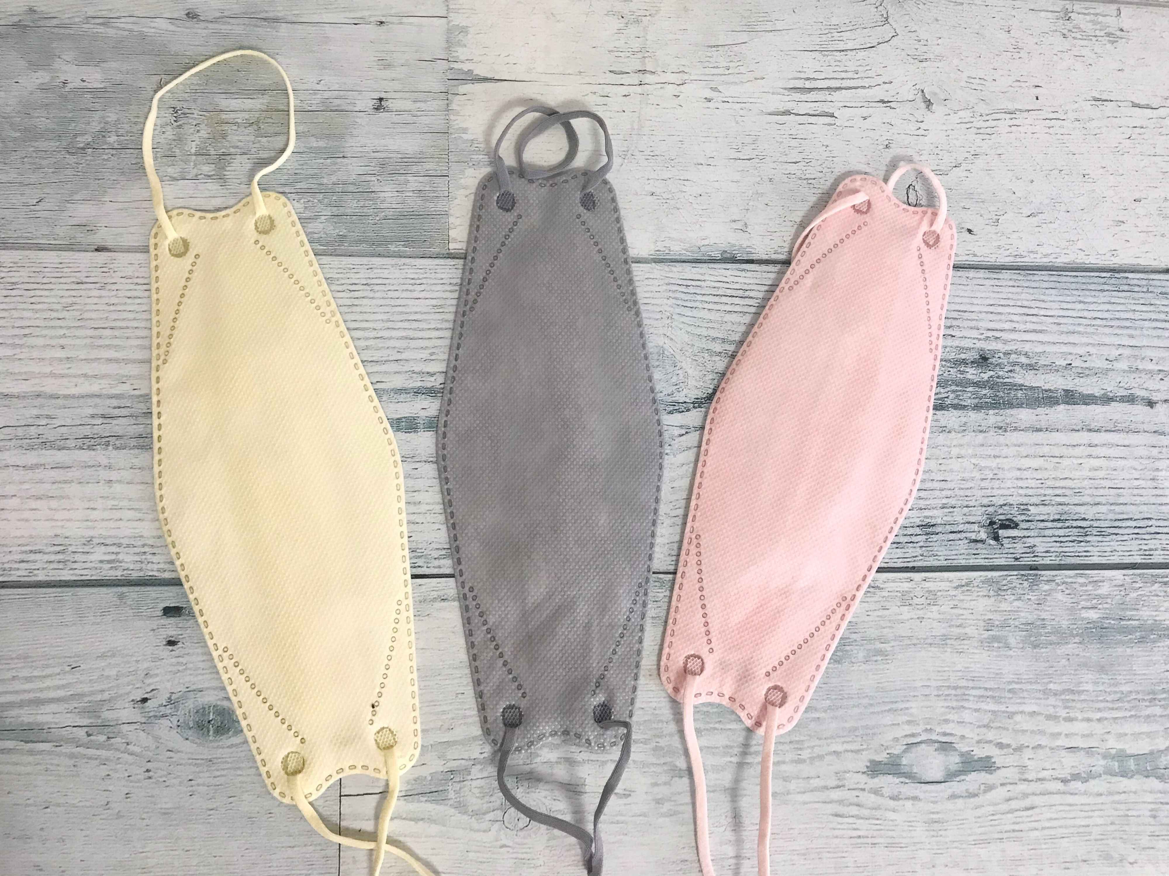 今回はベージュ・グレー・ピンクを購入したのですが、接触冷感タイプではないDAISOの3D MASKと比べてカラーが明るめの印象です。ベージュはほぼイエローと思って正解。グレーは男性でも使用しやすい印象です。ピンクは明るめのパステルピンクで顔のイメージを華やかに見せてくれます。