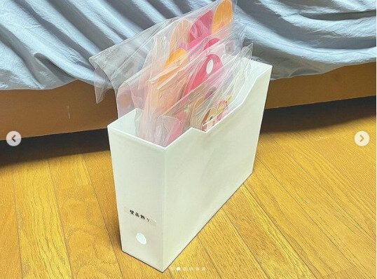 マフラーなどのシーズンものの収納にも100均のファイルボックスが役立ちます。マフラーをジップロックに入れて収納し、ファイルボックスに立てるだけ。立てて収納できるため、スペースを取ることがありません。ファイルボックスを使うので、気がついたら倒れてぐちゃぐちゃになる…といった心配も回避してくれますね。